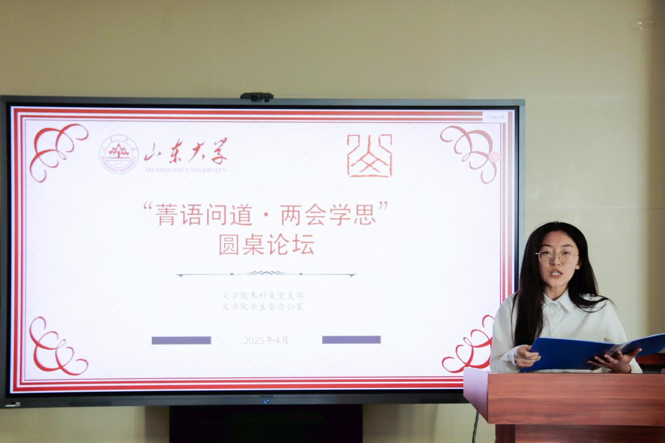 会议伊始,李怡彤简要介绍了本次论坛的举办背景与讨论目标。她阐述了本次论坛的研讨主题,说明讨论内容聚焦两会精神、关注时代热点,并涵盖思政教育、文化传承、文学创作和中外交流等多个重要领域。她表示,各位同学应以此次论坛为契机,学思践悟两会精神,坚定理想信念、勇于担当作为、砥砺奋进向前,为实现中华民族伟大复兴的中国梦持续奋斗。