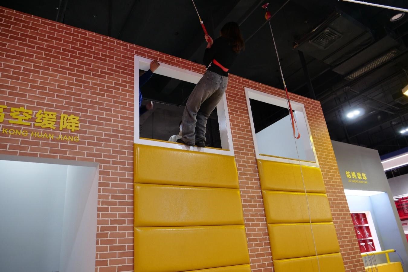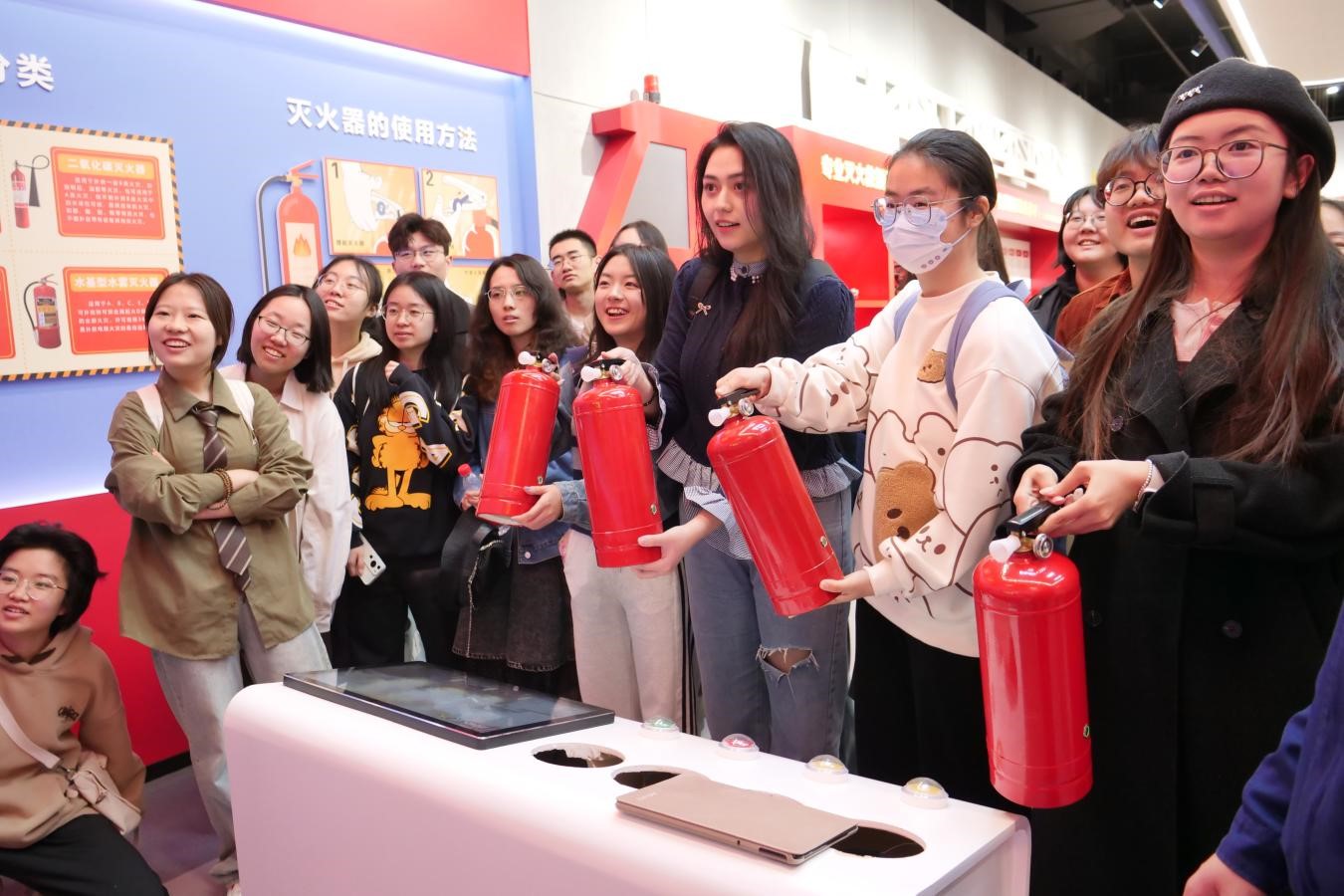 体验为要,掌握技能。基地内八大展区设置了丰富的体验环节,师生们踊跃投身其中以提升防灾减灾能力。在灭火演练区,参访同学与AI接警员对话,并利用VR技术模拟在厨房、办公室等不同环境灭火的步骤,掌握了针对不同类型火灾正确选择灭火器的知识。同学们还在消防员的指引下,学习逃生绳结打结步骤,并利用楼房模型练习绳索速降技巧。在多样仿真的体验互动中,师生们真切感受到每一场火灾事故的突发性、紧迫性、复杂性,提升了应对险情的自救自护本领。