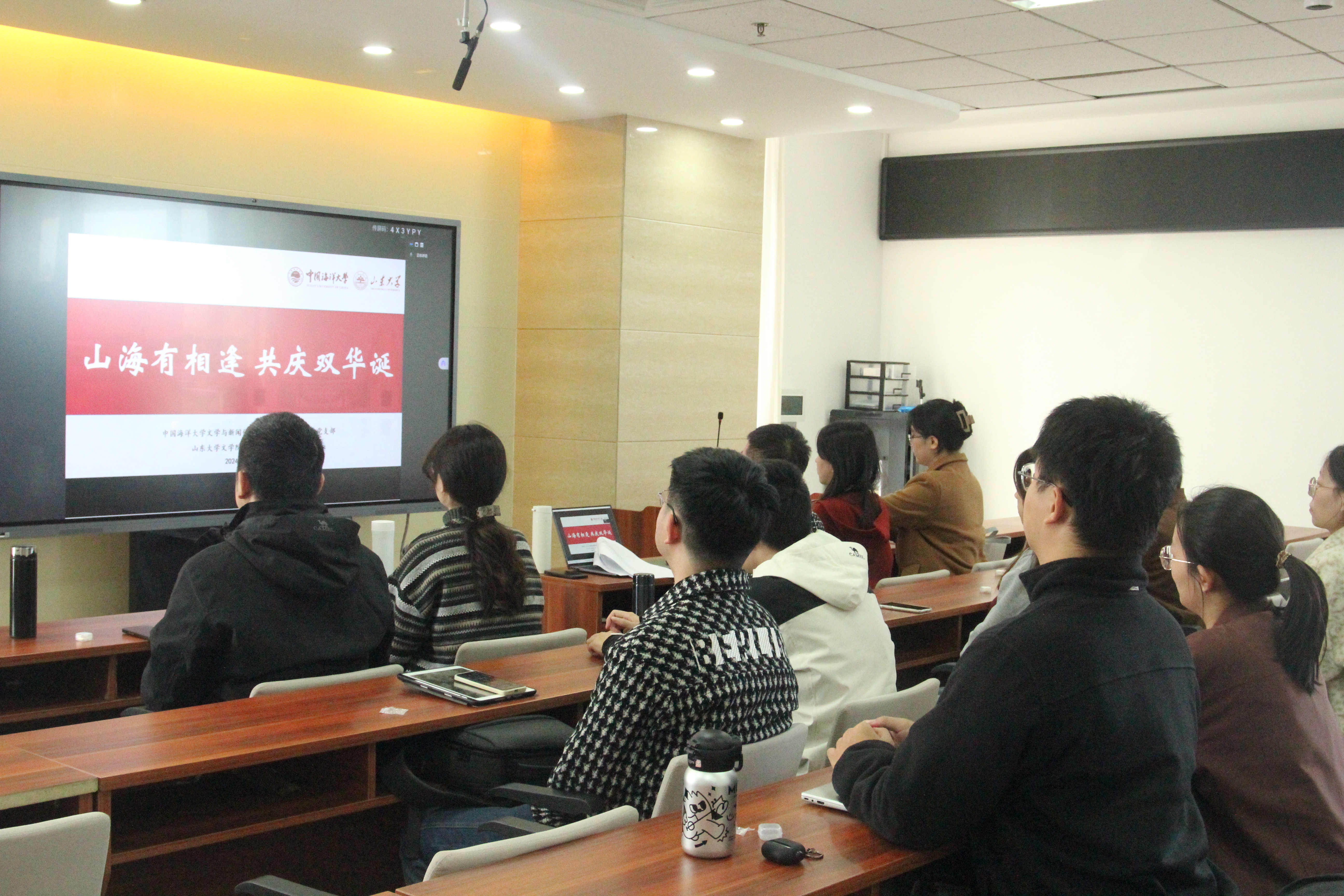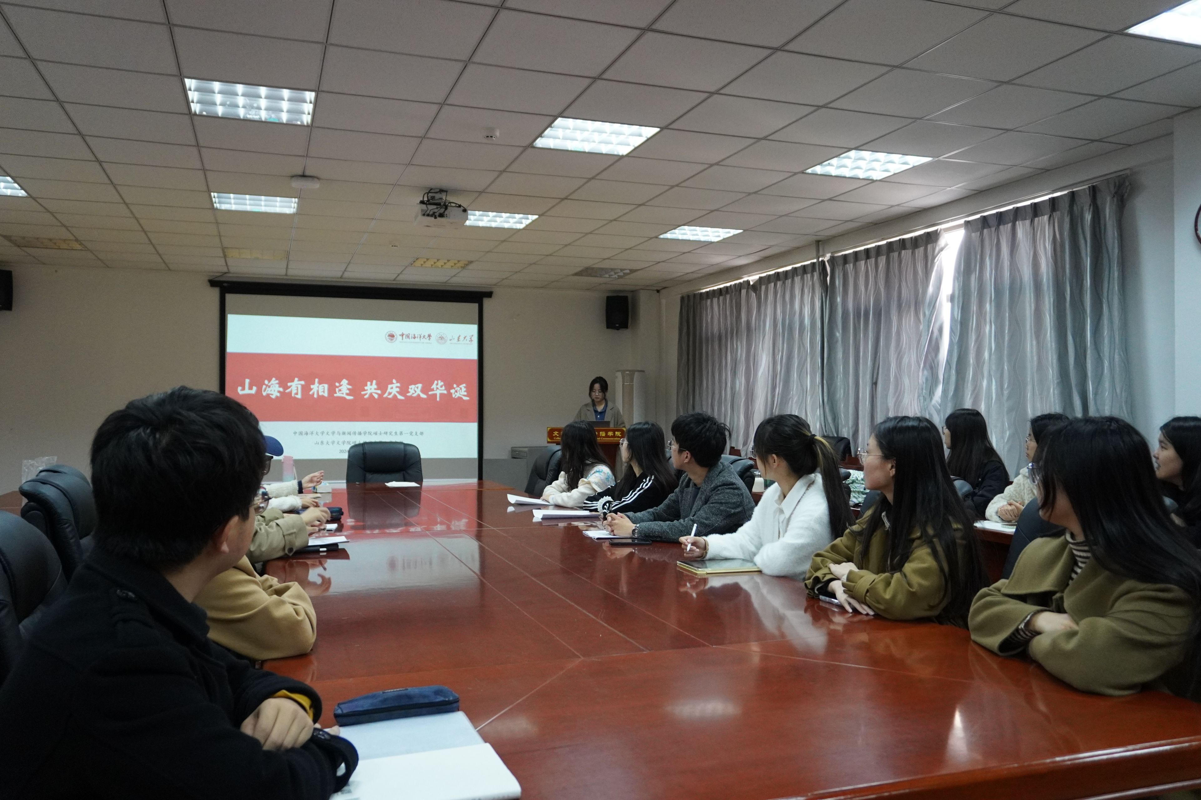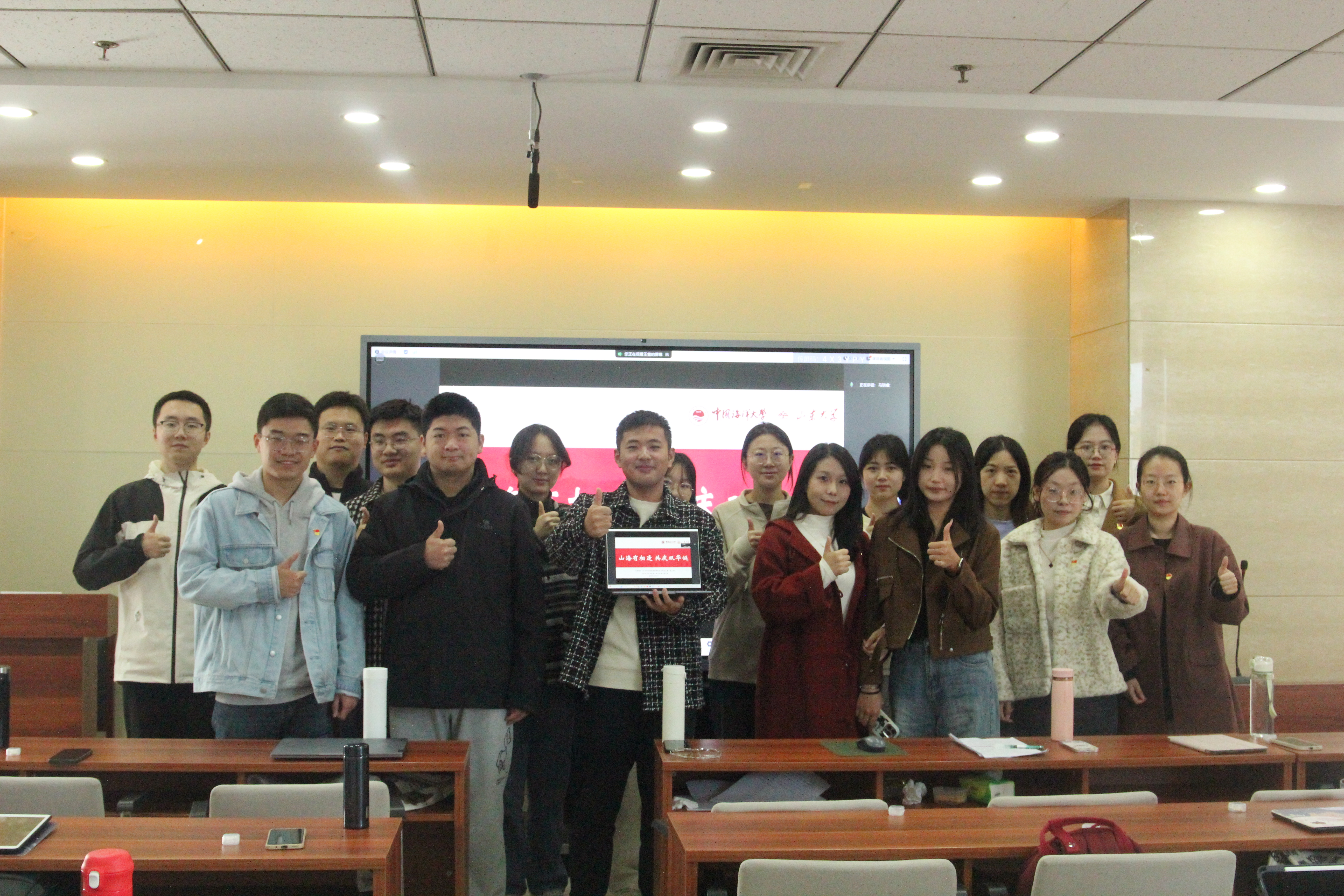 山魂海韵启文澜,砺志砥德谱华章。恰逢BEAT365英国官网网站123周年校庆,为深入学习贯彻党的先进思想,激发青年党员的创新活力,10月23日上午,我院硕士研究生第六党支部联合中国海洋大学文学与新闻传播学院硕士研究生第一党支部,以“山海有相逢,共庆双华诞”为主题举办了“学习思想,创新青年”读书会。会议在BEAT365英国官网网站知新楼A座606室、中国海洋大学文新楼322室举行,设置腾讯会议线上会场,活动由公司硕士研究生第六党支部书记李方政主持,两支部党员同志到场参会。