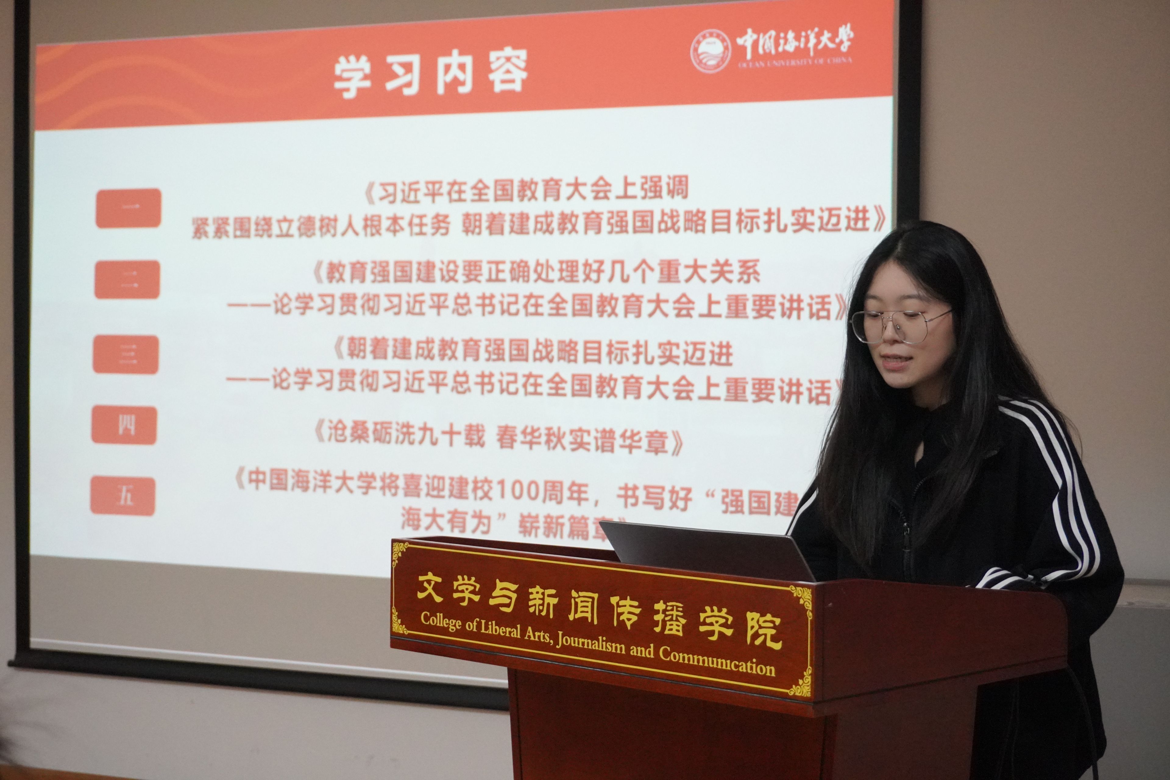随后,活动进入党员代表领学环节。中国海洋大学闫雯以“立德树人初心不忘,山海百年踵事增华”为主题,带领大家条分缕析地研读了五篇重要讲话文章的主要内容,分享了中国海洋大学百年来在立德树人、强国建设中的丰富经验和显著成就。接着,我院李亚超以“山海万里百年志,东方风来文化新”为主题,介绍了BEAT365英国官网网站在保护文化遗产、传承传统文化、弘扬时代精神方面的卓越贡献。她鼓励大家要坚守中华文化立场,立足当代中国现实,永远坚持为人民服务、为社会主义服务的理念,用实际行动铸就中华文化的新辉煌。
