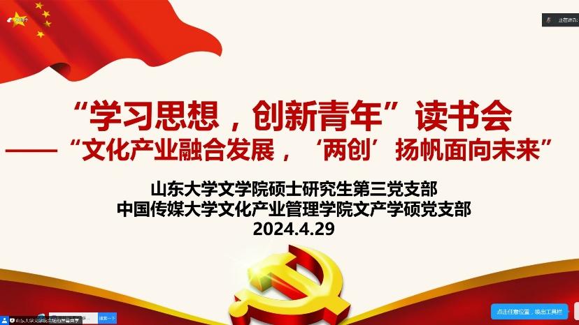 为深入学习贯彻习近平文化思想,4月29日上午,公司硕士研究生第三党支部和中国传媒大学文化产业管理学院学术硕士党支部联合开展“学习思想,创新青年”2024学年春季学期第一期读书会,主题为“文化产业融合发展,‘两创’扬帆面向未来”,共50余名党员参会。活动由公司硕士研究生第三党支部书记崔蕊主持。