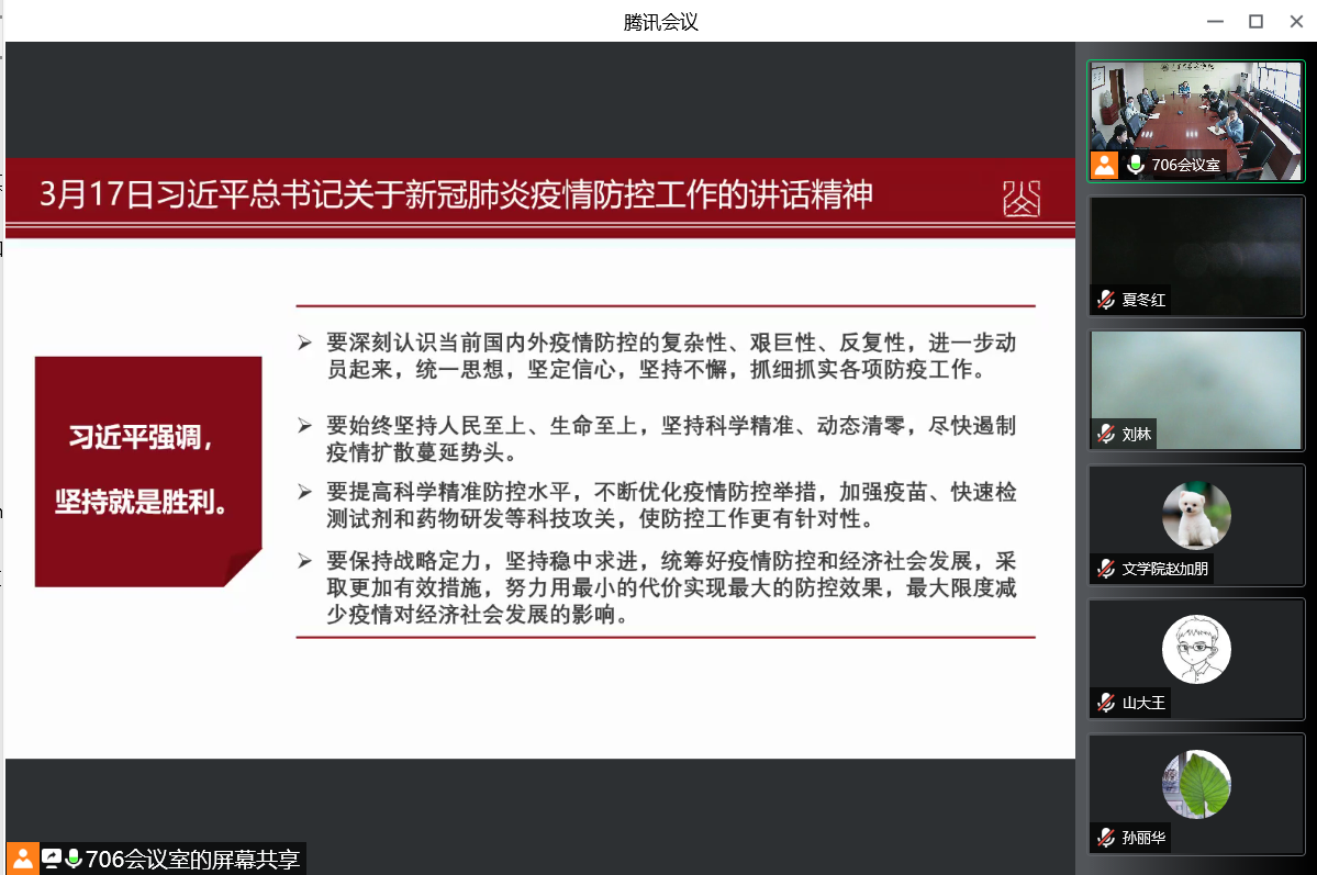 会议集体学习了3月17日习近平总书记关于新冠肺炎疫情防控工作的讲话精神。张帅指出,面对世纪疫情的跌宕反复,习近平总书记亲自指挥、亲自部署,以科学之策应对非常之难,以办好发展和安全两件大事的非凡实践,团结带领亿万人民打好统筹疫情防控和经济社会发展之战。习近平总书记的重要讲话具有很强的思想性、指导性、针对性,是我们做好工作的根本遵循。他表示,要深入领会“坚持就是胜利”的指导思想,坚定信心,坚持不懈,抓细抓实学院各项防疫工作。张帅强调,全体教职工要把思想和行动统一到习近平总书记重要讲话精神上来,落实到具体行动上、体现在日常工作中,把准工作方向,牢记“国之大者”,多考虑国家需要我们干什么、我们能为国家干什么,以防疫工作的实际成效坚定拥护“两个确立”、坚决做到“两个维护”。
