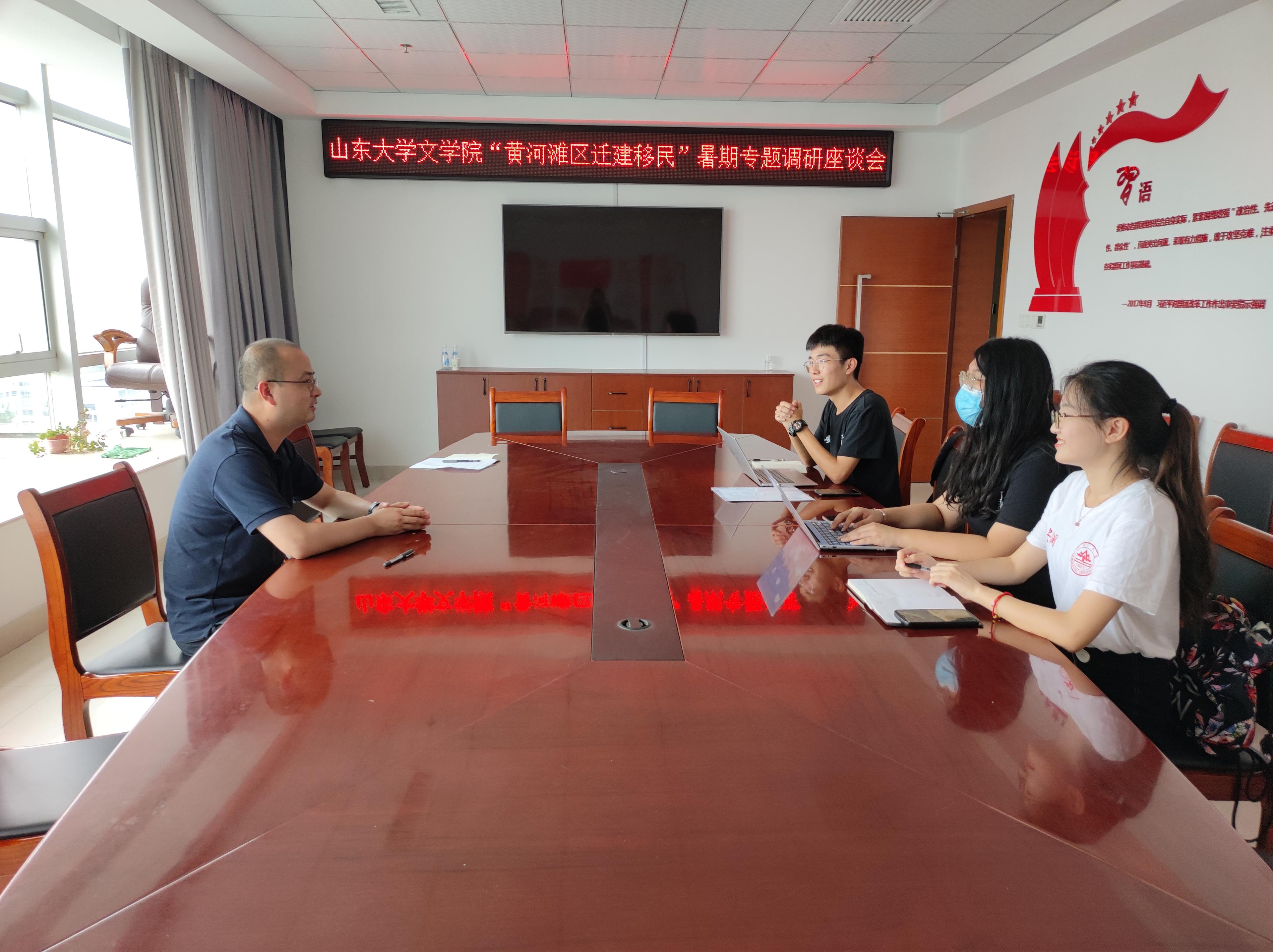 7月19日下午,团队成员抵达东营区人民政府,受到了东营区团委的热情招待。团委领导与团队成员共同举行了以“黄河滩区迁建移民”为主题的暑期专题调研会。在研讨会中,共青团东营区委副书记李超首先对实践队的到来表示欢迎,并高度评价了团队的调研主题,认为此次调研活动具有重要意义。接下来,队长窦宇向与会人员详细介绍了此次调研的目的及安排。队长介绍,此次调研将围绕黄展区迁建社区居民的适应性问题、土地流转和文化旅游等问题等展开,探索研究在习近平总书记表示过关怀的社区中乡村振兴的新模式。李超表示,团委会积极协助实践队开展工作,支持青年学子以实地调研的形式了解黄河治理与乡村振兴这一国计民生的重要方面。此外,李超和团委工作人员为队员们提供了进一步增加调研可行性的建议,认为队员们可以更加全面地进行调研计划,确定访谈对象和访谈内容等,以便更加高效地开展工作。最后,李超叮嘱队员们在实践中要注意疫情防控等相关安全问题,并预祝实践活动圆满完成。