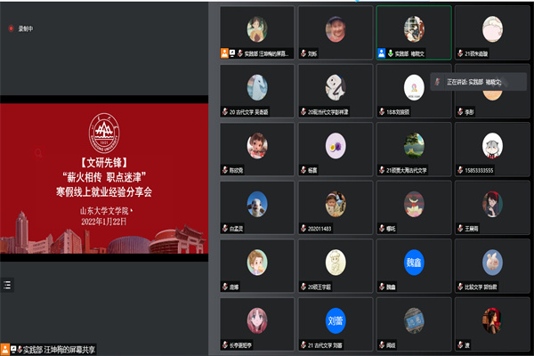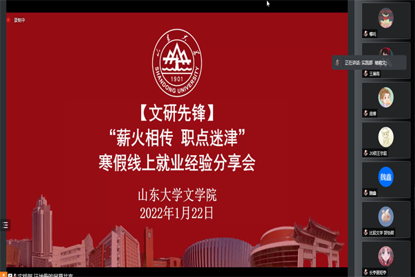 本次“薪火相传,职点迷津”研究生寒假线上就业经验分享会充分发挥文院优秀学子的先锋模范作用,采用优秀毕业生分享求职经验的形式,建立了毕业生与在校生间的良性互通,为公司学子提供了宝贵经验,有利于同学们进一步明确就业方向,提升求职技巧,增强求职信心。相信同学们定能以优秀学长学姐为榜样,汲取营养,坚定前行,逐梦未来,向着自己的职业目标拼搏奋进。