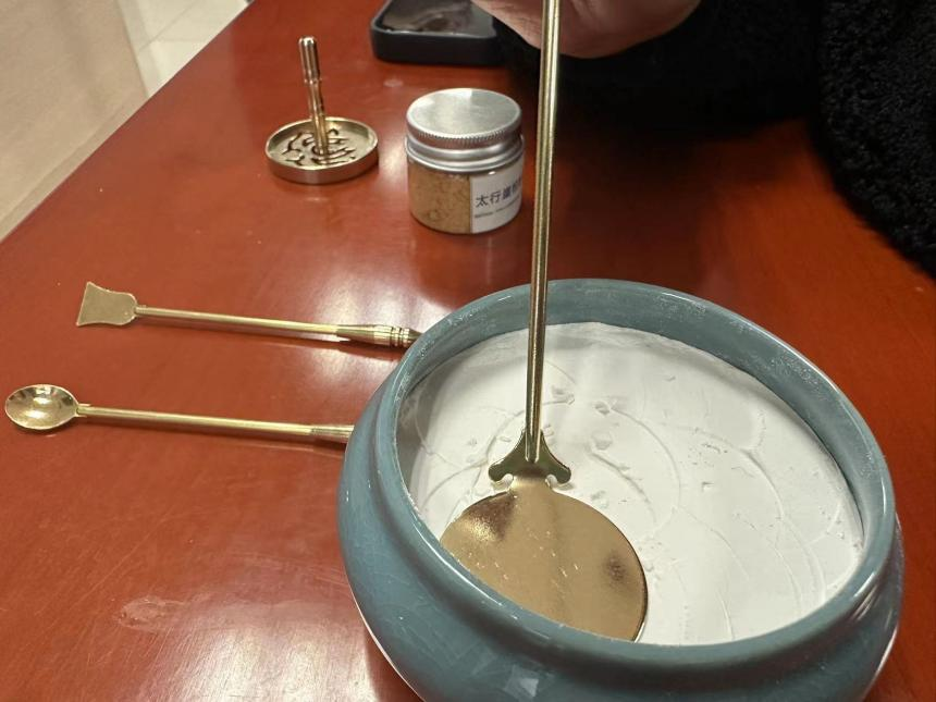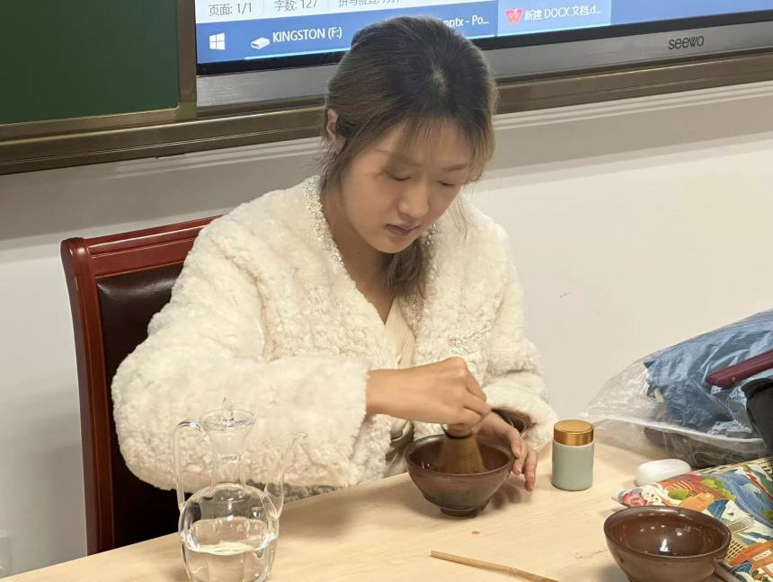 在主讲人的指导下,同学们纷纷体验了打香篆和点茶这两种中国传统文化的独特魅力,逐步完成了“填灰,压灰,放香印,填香粉,起篆”的整个过程。在这个过程中,同学们不仅学会了如何制作香篆,更在平心静气中体验到了心灵的宁静与和谐。