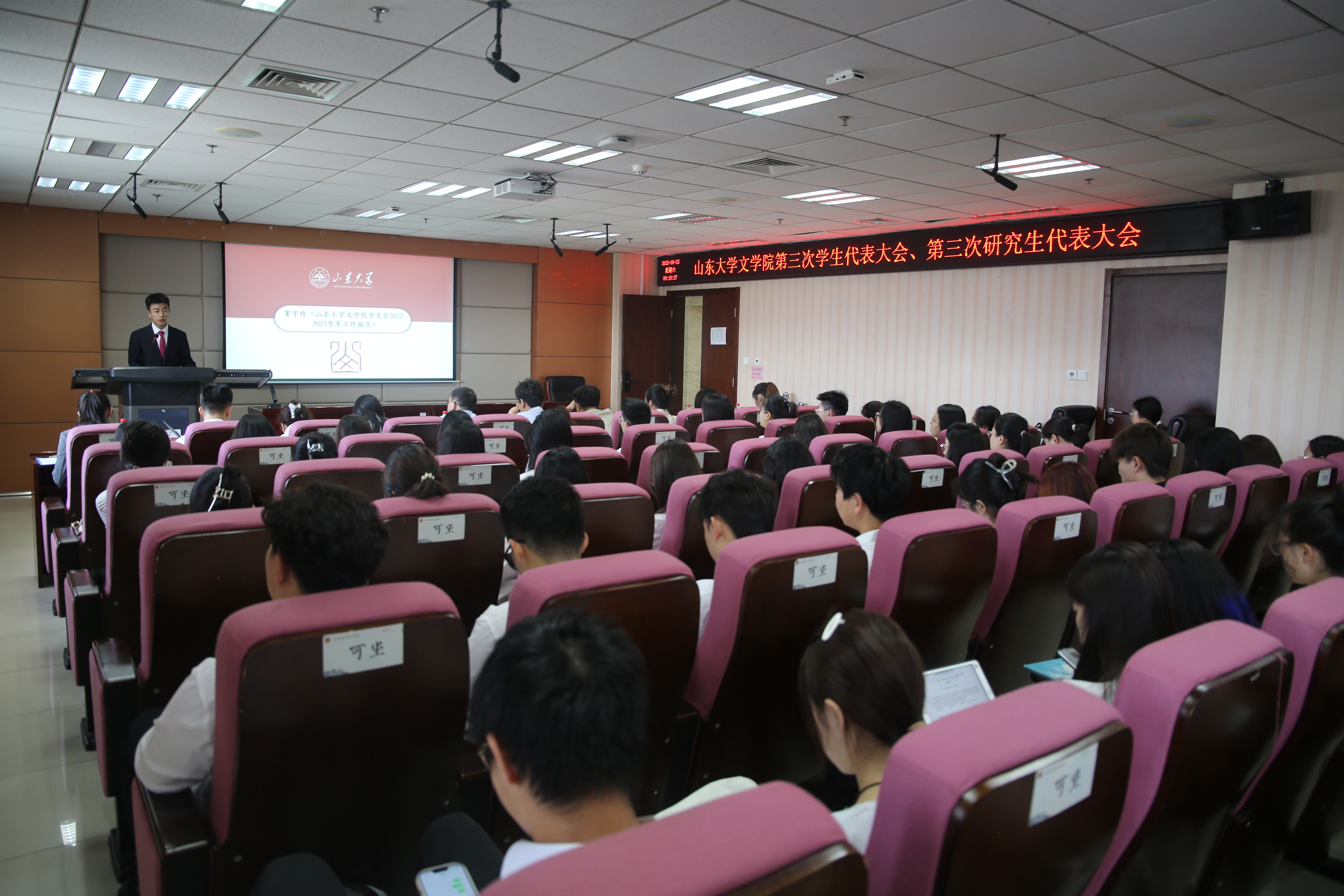 会议在庄严的国歌中拉开帷幕。第一次全体会议上,院员工会负责人窦宇、院研究生会执行主席宋海涛分别代表2022届员工会、研究生会作工作报告。
