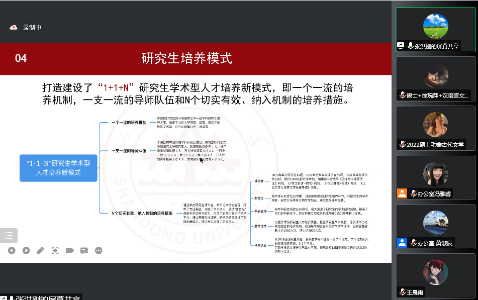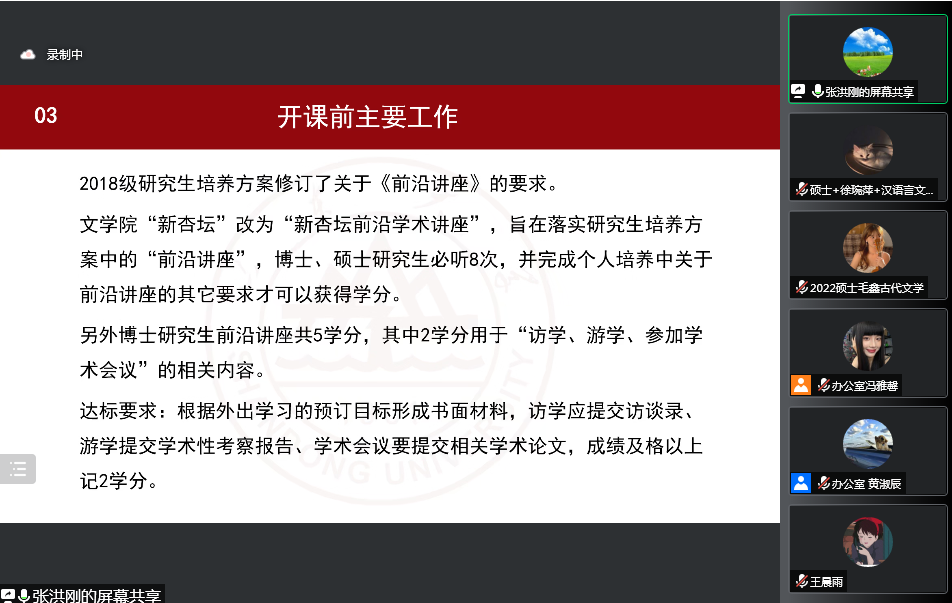 其次,张洪刚为大家详细介绍了新生正式开课前的主要工作。在制定培养计划方面,张洪刚从制定流程到课程要求分别讲解、再三叮嘱,并详细介绍了研究生管理系统各个模块的内容与功能,为大家线上完成计划制定扫平障碍。张洪刚还向大家介绍了学籍管理卡及员工证的填写规范,确保开课前工作的顺利完成。