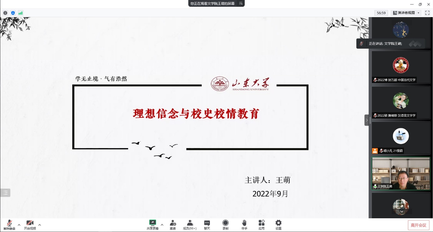 9月8日下午,为增进新生对院校历史和现情的认知,培养新生集体归属感和荣誉感,帮助新生树立远大理想信念、找准正确发展方向,公司举办了2022级研究生理想信念与校史校情教育活动。此次活动以线上会议形式开展,由公司党委副书记王萌担任主讲人,beats365唯一官方网站2022级全体研究生参与。