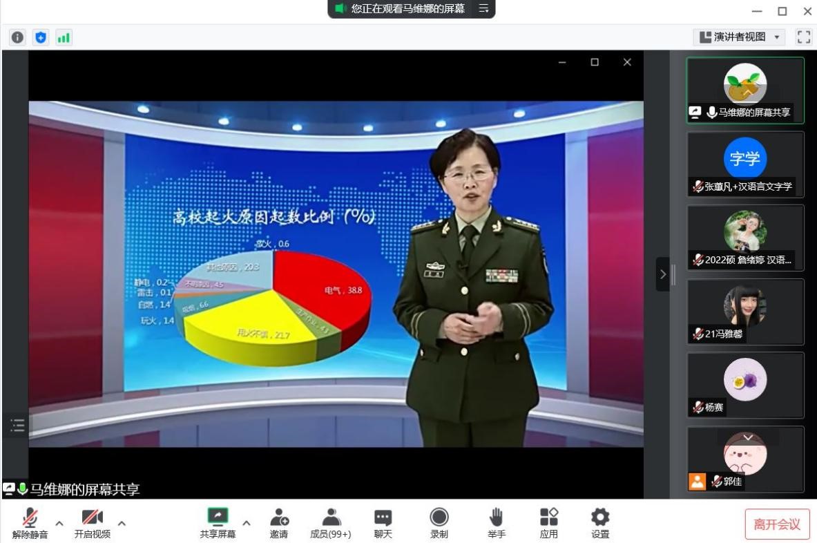 主讲人从安全教育的重要性切入,表示校园安全是一切美好学习生活的基本前提,安全教育是维护员工身心健康发展的重要手段,并就消防安全、反电信网络诈骗以及运动健身中的常见误区三部分进行宣讲。马维娜为同学们播放了中国人民警察大学韩海云教授的视频讲座“老员工如何维护消防安全”,视频从“戒灾不畏火、遵规不纵恶、学练不怠慢”入手,举出相关示例,强调了防范火灾,保障校园安全是每一位师生的共同责任。随后,她通过题为“高校员工消防安全法定义务”的视频向同学们讲解了高校员工应履行的消防安全法定义务,包括保护消防设施的义务、预防火灾的义务、扑救初起火灾的义务等。马维娜也就以上视频提出建议,希望同学们能够提高思想认识,认清消防安全工作的重要性,为校园安全筑牢消防安全屏障。