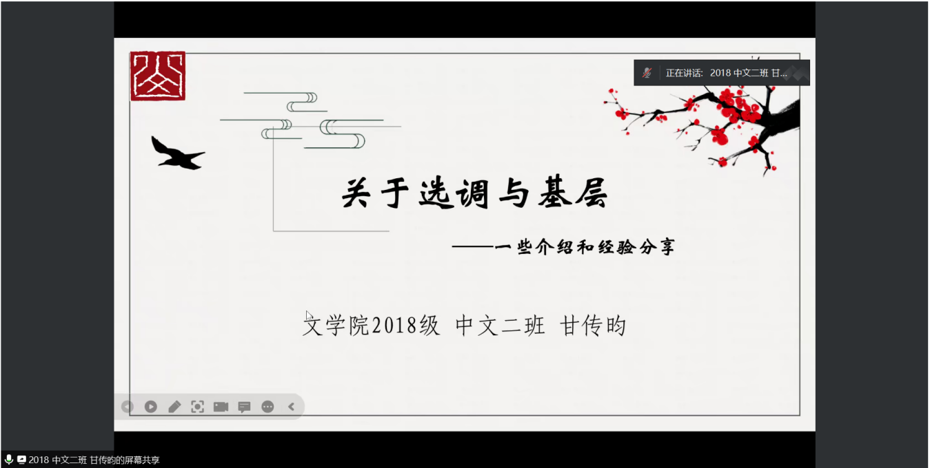 坚守初心,扎根基层。甘传昀结合自身经历,聚焦生涯规划,围绕选调与基层分享相关经验。甘传昀强调,相比于职业选择,如何建立正确的自我认知和规划才是最应该着眼的问题。面对职业选择与成长,我们无捷径可走,只有经风雨、见世面,才能壮筋骨、长才干。正因此,“自立自强”在人生前进之路上具有重要意义。甘传昀表示,希望公司学子能自立自强、求真求实,在青春的道路上奋力奔跑,书写属于自己的青春华章。