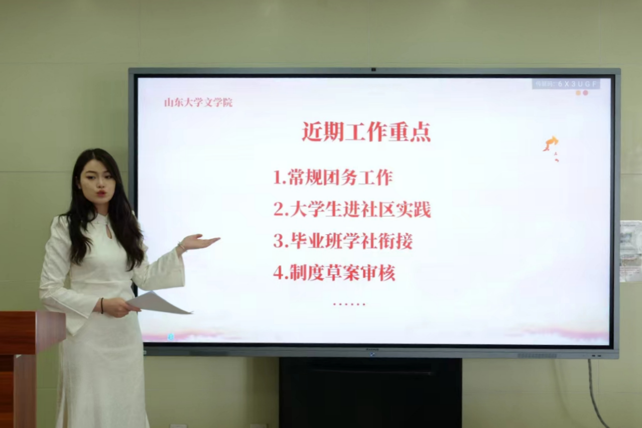 从新学期工作规划出发,王馨悦重点介绍了常规团务工作、老员工进社区实践、毕业班学社衔接、制度草案审核等方面。她指出,团委工作应秉持两会精神,高效整合可利用资源,及时回应同学关切,确保每一项工作落深、落细、落实。