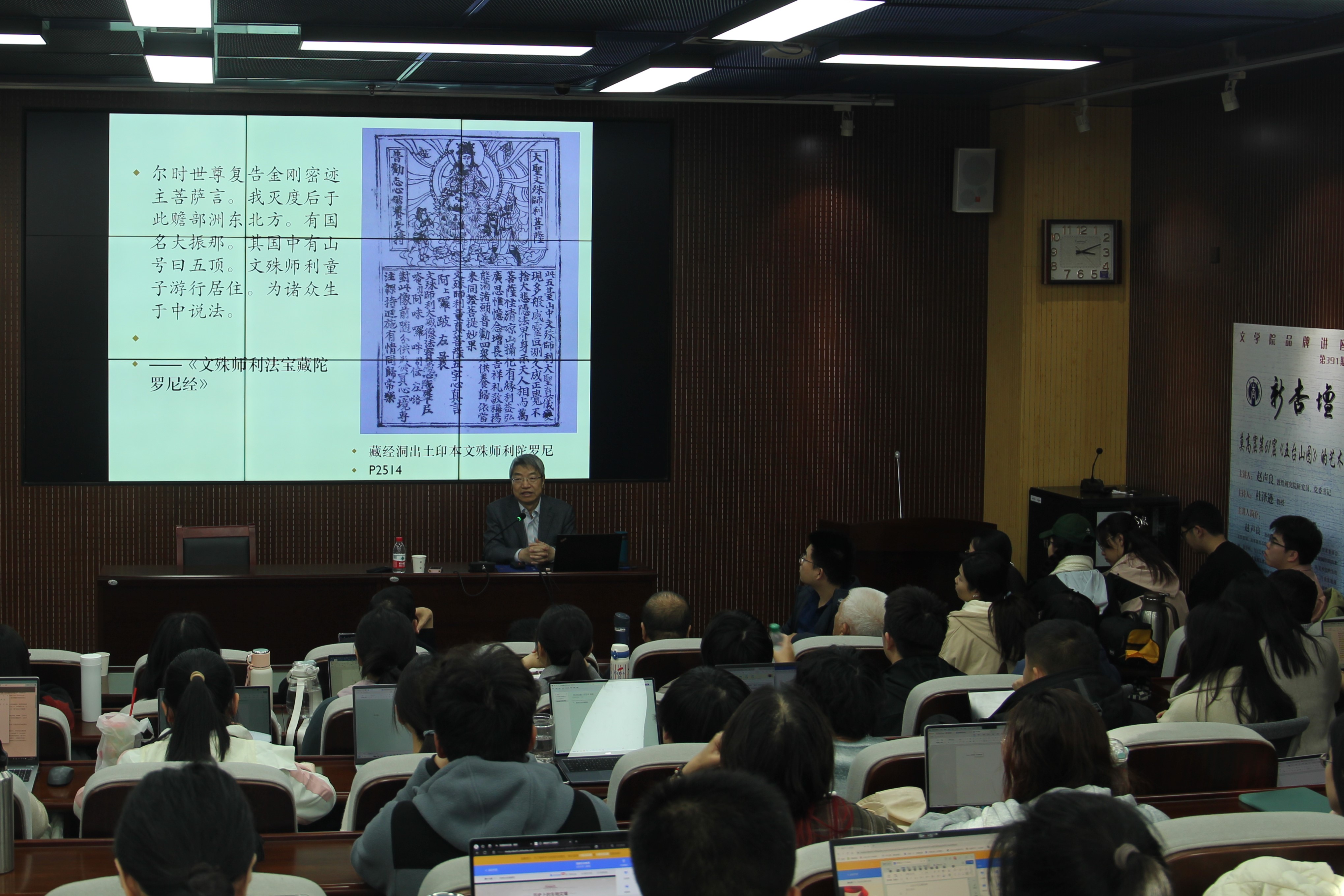 赵声良研究员以图像学与文献学相结合的方法,通过“湖南送供使”图像历史时代的考证,通过敦煌写本《腊八燃灯分配窟龛名数》对“文殊堂”的记载,精确考定61窟五台山图制作的时代在五代时期的947-951年。并对莫高窟现今所存自中唐到五代时期的五台山图进行了梳理,兼及敦煌写本白画和绢画。讲座最后环节还向大家介绍了《清凉传》《广清凉传》之外,国外新见的清康熙年间《清凉外传》刻本及其中的《五台山全图》。是一场佛教史迹画研究的典范示例。