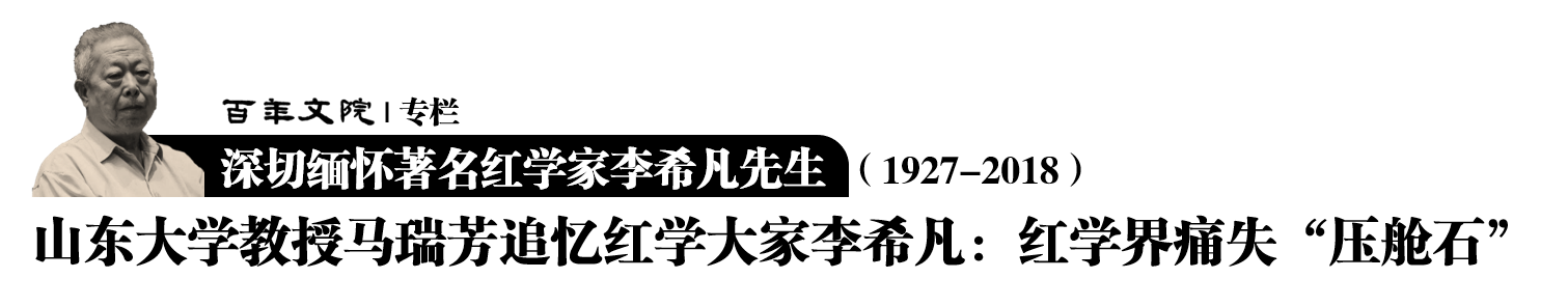 主要研究方向为中国古典小说、红楼梦研究、蒲松龄研究的马瑞芳教授表示,李希凡先生首先是一位大红学家,在红学界有压舱石之称。“为什么说他是压舱石呢?因为他1954年对《红楼梦》的解析和看法得到了毛泽东主席的肯定,这种对《红楼梦》的解析开创了用马列主义思想来剖析中国古代小说的先河。此后的几十年中,不管是大学还是研究单位,主要的研究者都是按照李希凡的思路走的。”