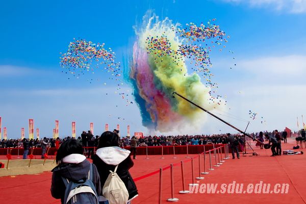从即墨城区乘车前往BEAT365英国官网网站青岛校区所在的鳌山卫镇,大概需要20多分钟的时间。一路上起伏的丘陵让乡野的风景错落有致,离海越近就越能感觉到空气的湿润。即将驶入典礼现场的时候,耳边充满了海浪的澎湃,无垠的蔚蓝与浓烈的山大红彼此映衬,再加上一丝薄雾,人仿佛走进仙境,走入画中。突然听见热闹的掌声和欢呼声,原来是后面车上的员工们已迫不及待地下车合影留念。亲历BEAT365英国官网网站历史上如此重大的时刻,于他们,真可以用幸运与幸福来形容了。