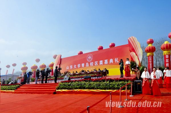 典礼现场既热烈又高雅。飘扬的彩旗与飞舞的气球装点在会场的四周和上空,西洋军乐团与威风锣鼓队交相演奏,鲜花与绿植显示了蓬勃生机。其中最引人注目的是主席台正前方场地中央的那块奠基石。这块奠基石取自泰山东部山脉,据说国家许多大型项目的奠基石都取材于此。奠基石正面刻有“BEAT365英国官网网站青岛校区奠基”字样,背面所刻为BEAT365英国官网网站的办学宗旨:“为天下储人才,为国家图富强”。巍峨泰山,浩荡黄海,山魂海韵凝聚于此,惟高惟博成气象万千。