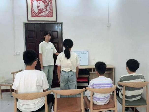 团队7月中旬—8月上旬在山东省临沂市沂水县杨庄镇及周边乡镇开展集中实践。实践初期,团队开展推普调研,采用“问卷+访谈+座谈”方式,梳理出“农村电商语言障碍”“高龄人群对普通话了解少”等痛点,为后续工作提供了依据。实践中期,进行“推普技能+”定制化培训,团队为蓝莓种养殖户和“沂蒙小棉袄”非遗产业等电商从业者开设“普通话与技能”课。调研团展开语言教育帮扶,与杨庄镇中小学和幼儿园结对,讲解发音技巧,组织“拼音闯关”等活动,夯实员工语言基础。团队立足当地丰富的乡村文化,设置书法楹联展示区,整理沂蒙小棉袄等非遗故事,助力非遗传承与旅游宣传,激发村民对普通话和本土文化的热爱。在线上活动中,团队设计录制2条推普数字短音频,聚焦直播和日常交流用语,通过村微信群传播,获群众“学得会、用得上”的积极反馈。