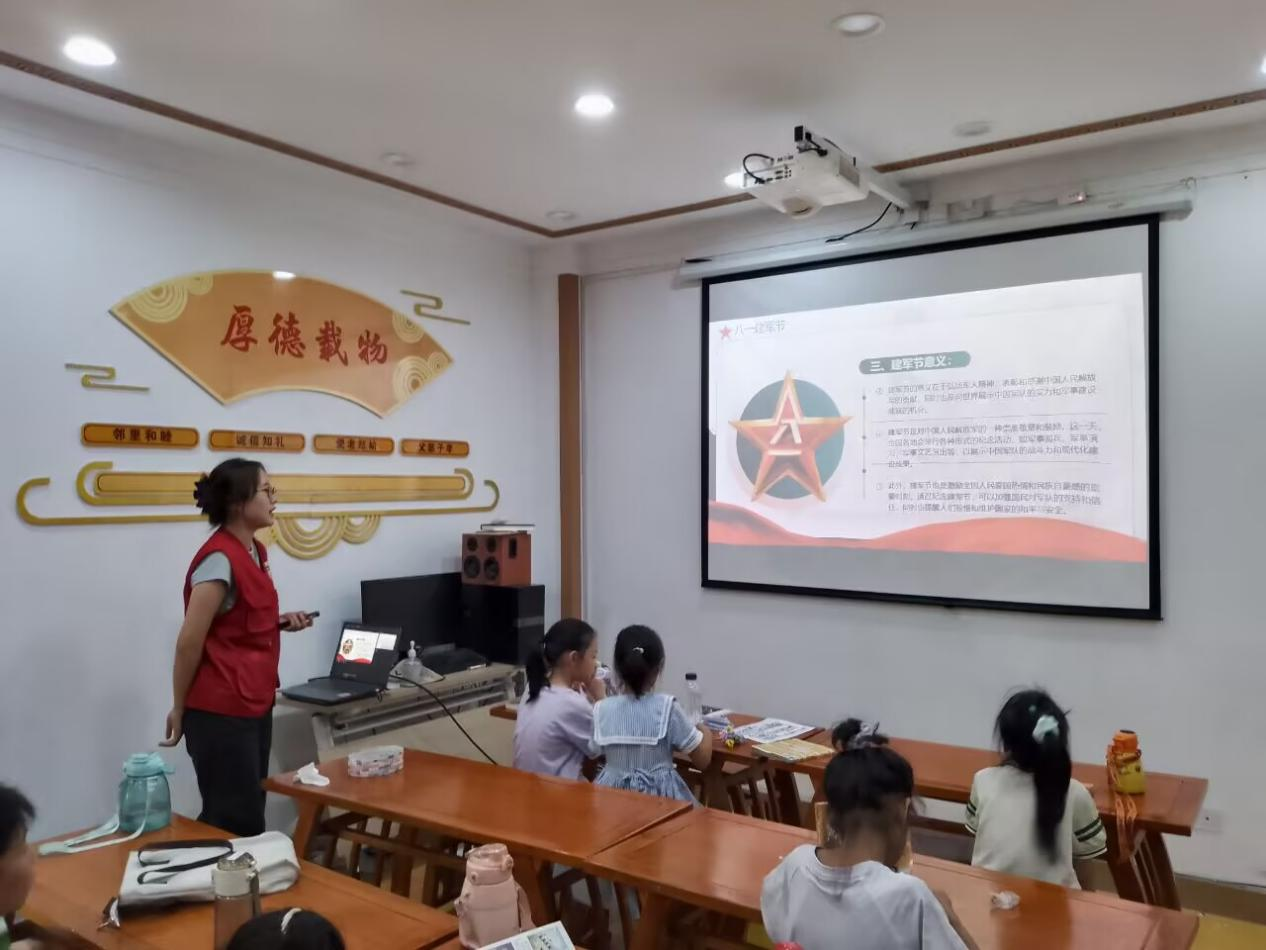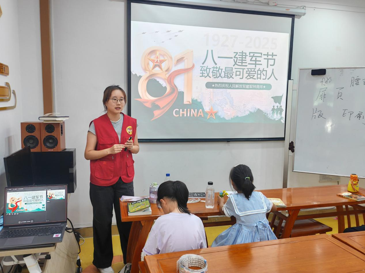 课程开始,支教队员郭美仪以“南昌城头一声枪响”为起点,系统讲述八一建军节的由来与发展。从1927年南昌起义揭开武装革命序幕,到1933年8月1日被确立为中国工农红军成立纪念日,再到新中国成立后正式定名为中国人民解放军建军节,支教队员以时间为轴、以史实为据,生动再现人民军队从无到有、从小到大的壮阔历程。孩子们在“历史问答”互动中明晰建军节既是对革命先烈的缅怀,更是对“枪杆子里出政权”真理的铭记。