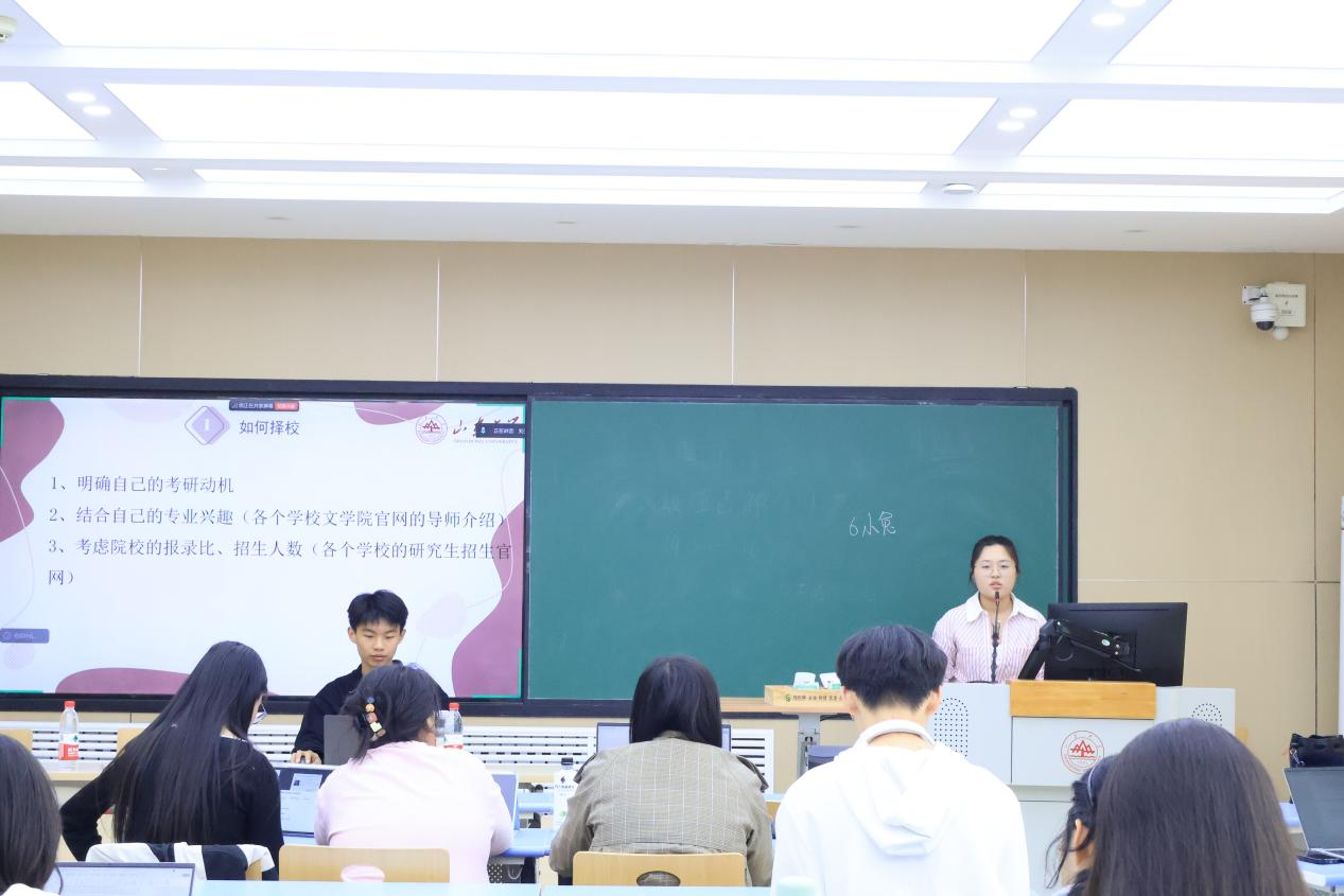 第三位进行分享的是王欣然学姐,她以考研分享为主题,与同学们分享了自己过去一年的心路历程。面对“如何择校?”这个问题,她指出同学们需要明确自我考研动机,并结合专业兴趣以及考虑院校的报录比和招生人数等信息进行综合考量,帮助同学们做到更好地选择报考院校。