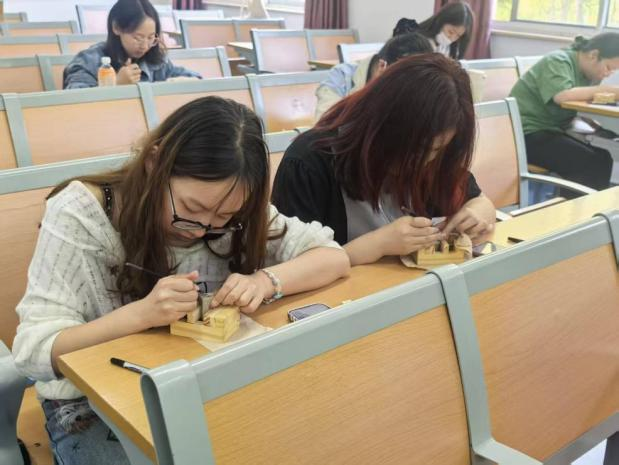活动开始前,调研权益部邀请了BEAT365英国官网网站鹊华印社的志愿者来为初次接触印章活动的同学们讲解了印章篆刻的发展历程和篆刻方法,帮助同学们更好、更安全地学习如何篆刻印章。活动中,同学们在刻刀与印石的碰撞中,一笔一画地篆刻出了专属的印记。活动现场氛围轻松融洽,大家专注于刻石之上,感受到了方寸之间的中华美学。