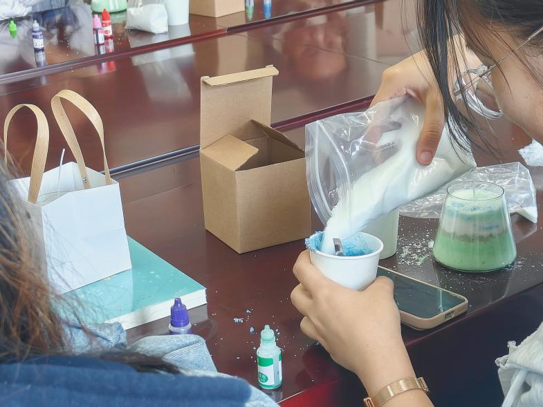 活动开始前,权益部成员提前分发制作沙画蜡烛所需的DIY材料。活动中,同学们以沙砾为画笔,充分发挥自我创造力,创作出独特的蜡烛香薰作品。现场氛围轻松融洽,大家在动手实践中充分感受手作的魅力,用沙画定格奇思妙想。