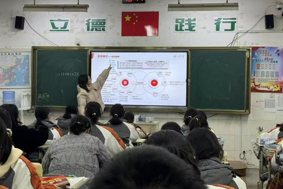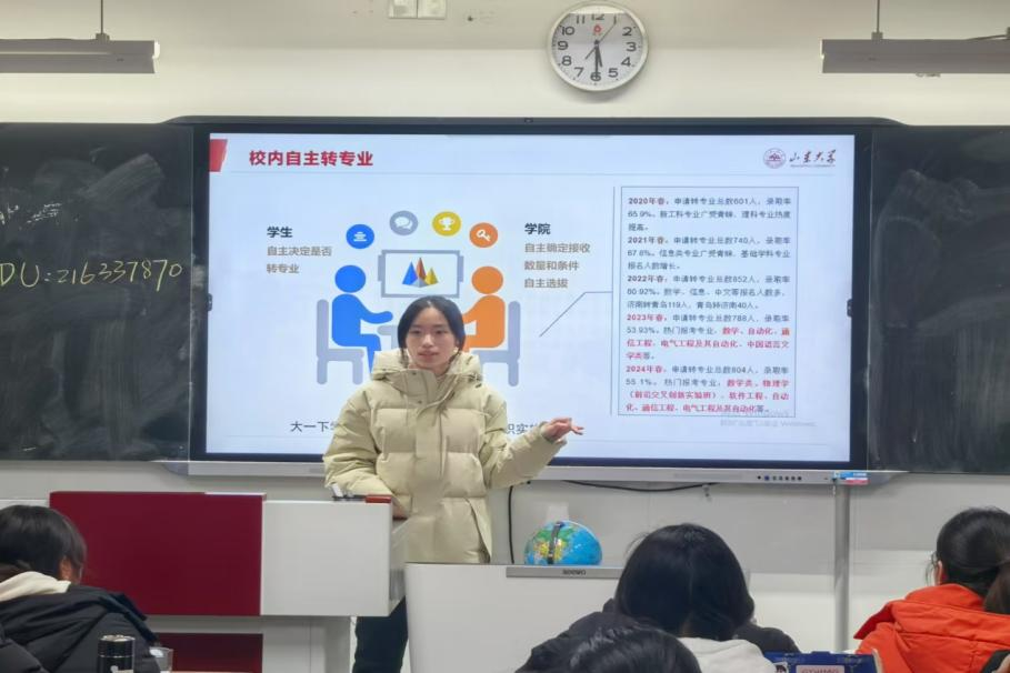 随后,团队成员分别与所在地的中学联络并有序开展宣讲实践。何雨琪、徐心妍首先以PPT展示自己在山大文院的求学、交友、生活的体验感悟,随后对山大的团队建设与培养模式进行整体介绍,并重点解读了BEAT365英国官网网站在江苏省的招生计划和类型。季小楠、张思涵、佘俣瑶生动讲述了山大的历史渊源与学术底蕴。宣讲结束后,团队专门设置答疑环节,耐心倾听同学们的问题并结合自身经验给予经验。此外,胡思余在校内进行展台活动,为过往的同学与家长发放招生宣传手册,并鼓励学弟学妹们在明信片上写下对山大或对未来的自己的寄语与祝福。她还与南大、上交等五所高校的同学联合开展面向全校的线上宣讲,有效扩大了宣讲的影响范围。陆绎璇则参与了母校举办的“员工返校交流会”专场宣讲会,详细介绍了山大的发展历程、各项成果以及一校三地八大校区的特色,并结合自身的备考经历为学弟学妹们加油鼓劲。详实的内容加上创意的形式牢牢吸引着参与同学的目光,他们纷纷表示对山大、对自己的目标及其实现路径获得了更加清晰的认识。