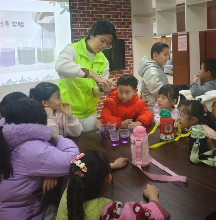 科学实验,打开探索大门。在“神奇紫甘蓝”实验课上,员工们调配白醋、小苏打等溶液,观察酸碱反应导致的紫甘蓝溶液色彩变化。在“科学秀”环节,支教队员们展示了火山喷发模拟、二氧化碳灭火、海底熔岩涌动等实验,引起孩子们的阵阵惊叹。