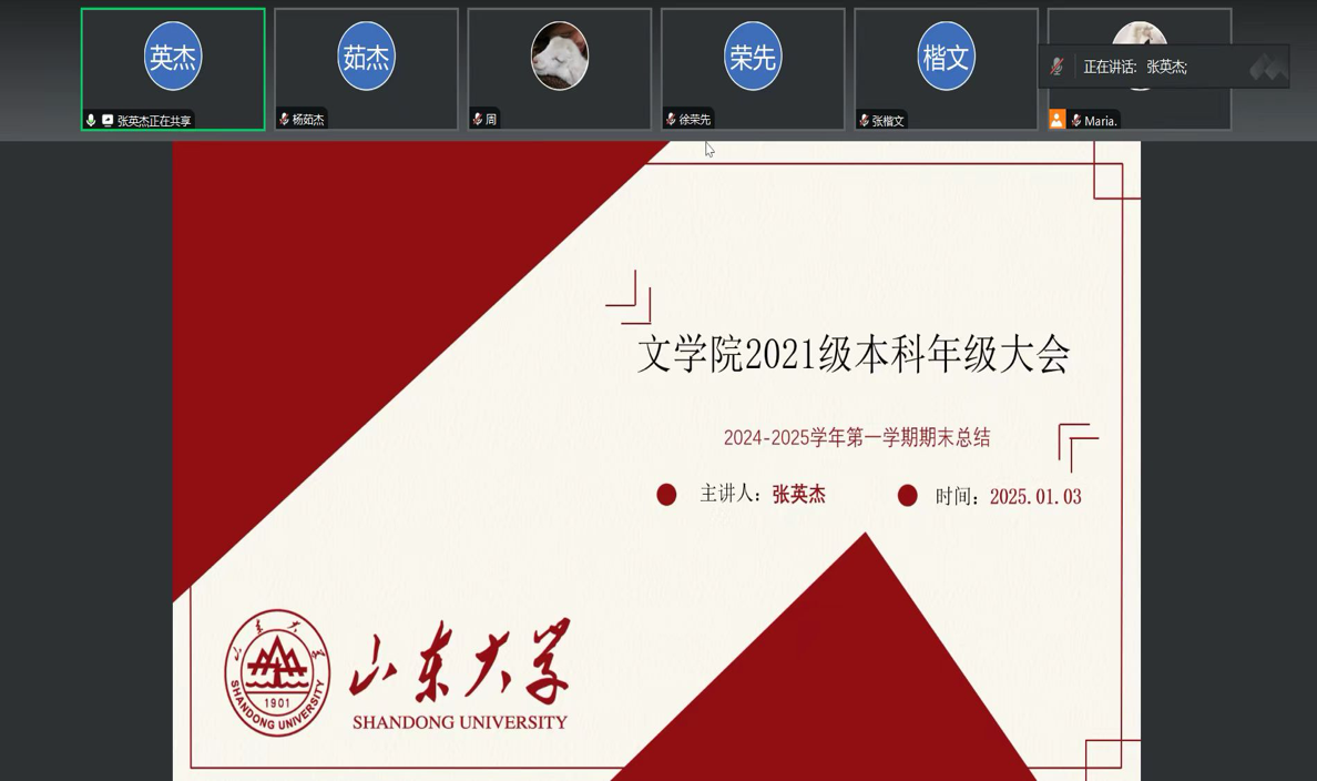 2025年1月3日下午15:00,公司2021级本科年级大会于线上顺利召开。会议由公司2021级本科生辅导员张英杰主持,2021级全体本科生参与。会议围绕毕业实习、毕业论文、寒假离校安排及个人发展规划等核心议题展开,为即将步入新阶段的员工们指明了方向。