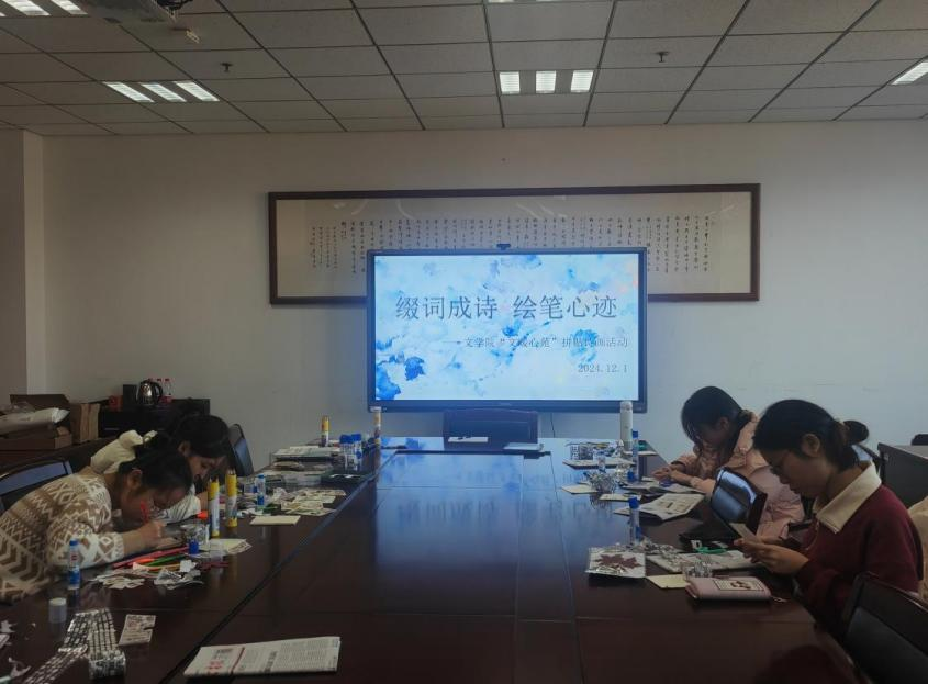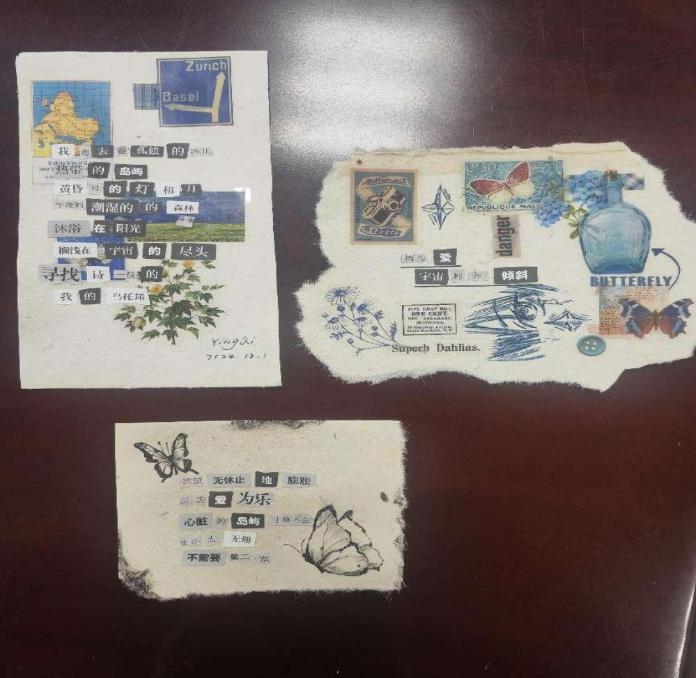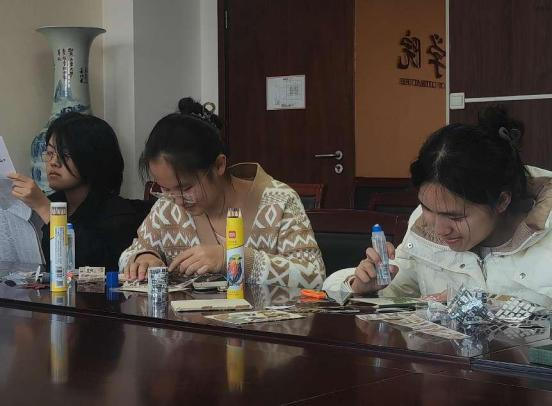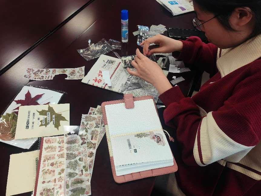 在活动开始前,权益部成员提前到场分发制作拼贴诗画所需的材料。活动开始后,伴随着优美的音乐,同学们凭借灵感在纸张上精心拼贴字词贴纸,并用落叶旧报进行点缀。在此次活动中,同学们尽情挥洒创意,于创作中体悟文艺魅力,以诗画编织心中的美好梦想。