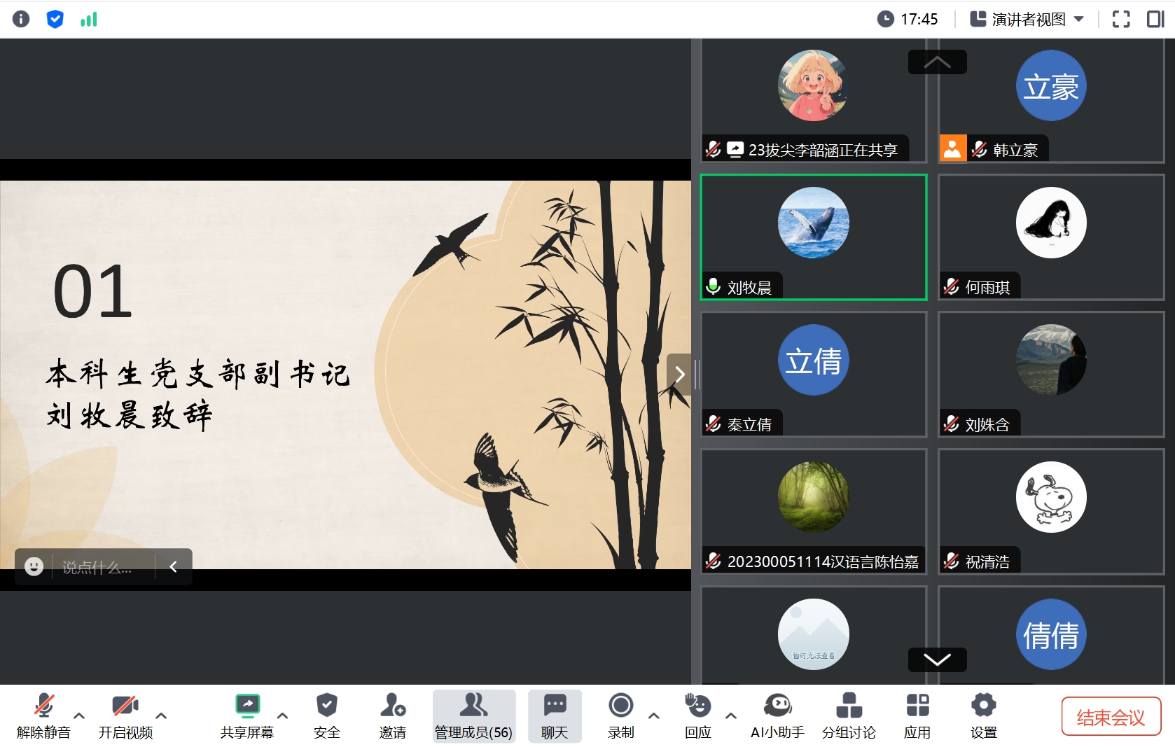分享会伊始,党支部副书记刘牧晨致辞,他结合自身经历指出此次分享会的重要性,劝勉大家尽早准备,为今后的学术道路打下坚实基础。对于站在十字路口的2023级本科生而言,这场分享会无疑是一场及时雨,为广大学子提供了宝贵的朋辈经验指导。