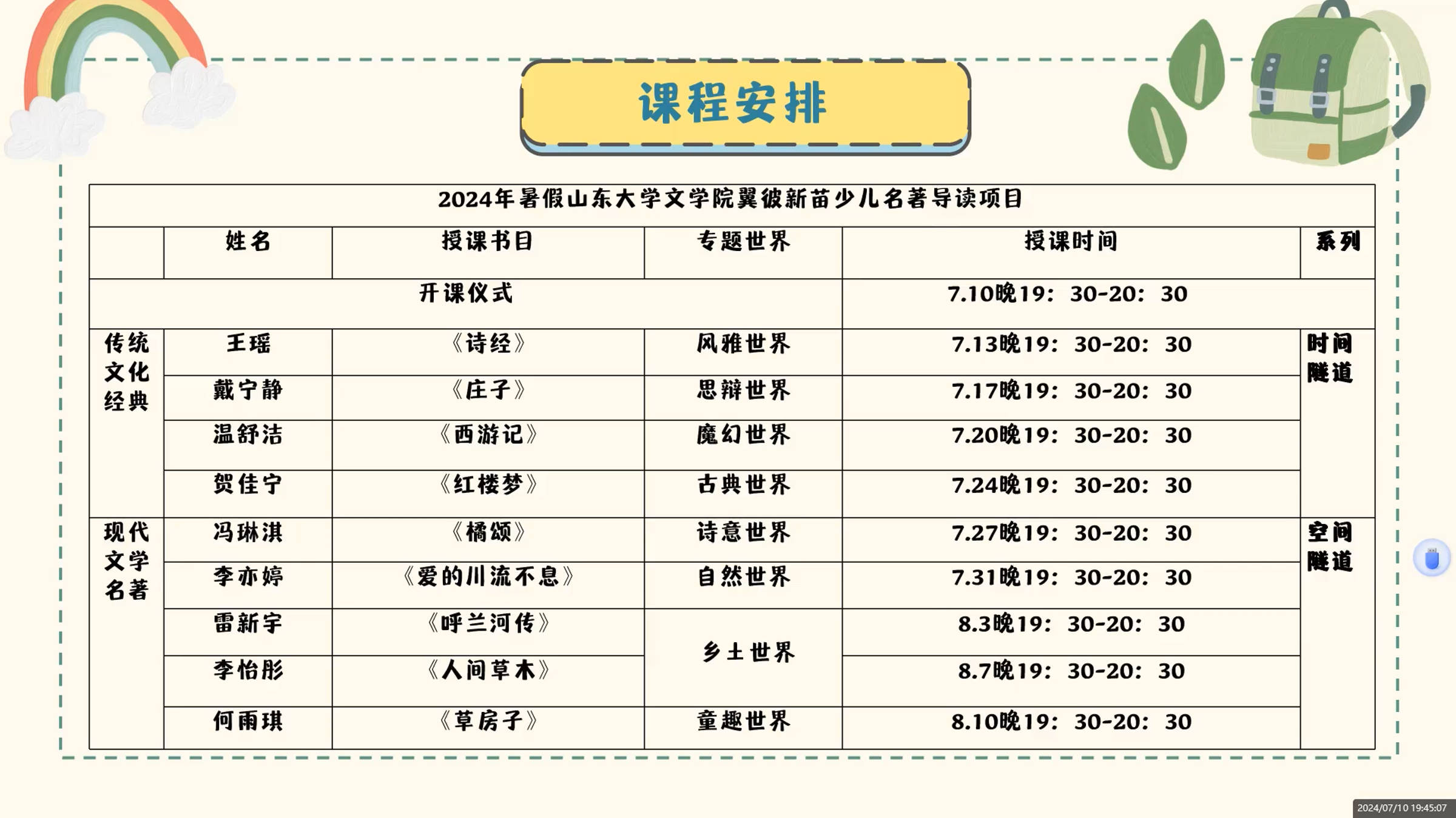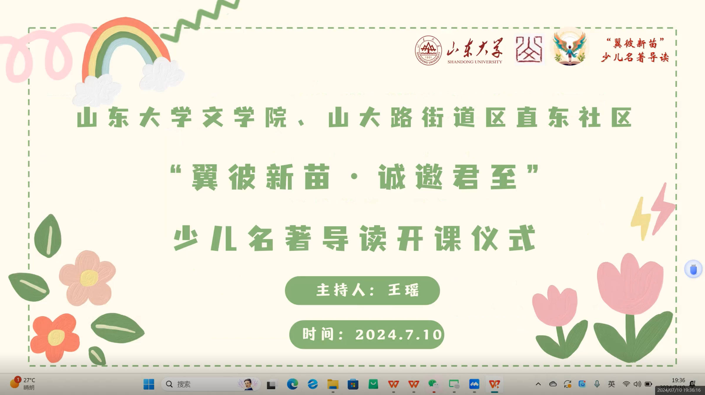 7月10日晚,“翼彼新苗·诚邀君至”少儿名著导读课程开课仪式于线上成功举行。团队负责人王瑶主持开课仪式,beats365唯一官方网站古代文学教研室助理研究员乐进进、本科生党支部副书记刘牧晨,区直东社区居委会活动项目负责人柴丽力应邀参加。