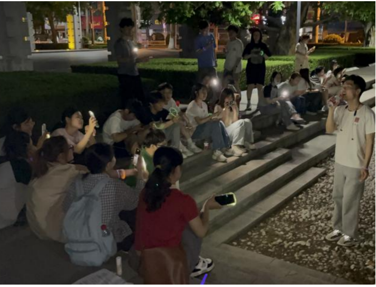 经过一番精彩的较量,白队与绿队最终打成平局。活动最后,耿铖坤、蔺华吉、谢欣奕为大家演唱歌曲《红豆》与《不值得》,同学们席地而坐,静静聆听。晚风徐徐,昏黄的灯光下人影交错,歌声、笑声、掌声随风飞向遥远的天边。在一片欢声笑语中,大家合影留念,“文院加速中”校园运动特辑活动圆满结束。