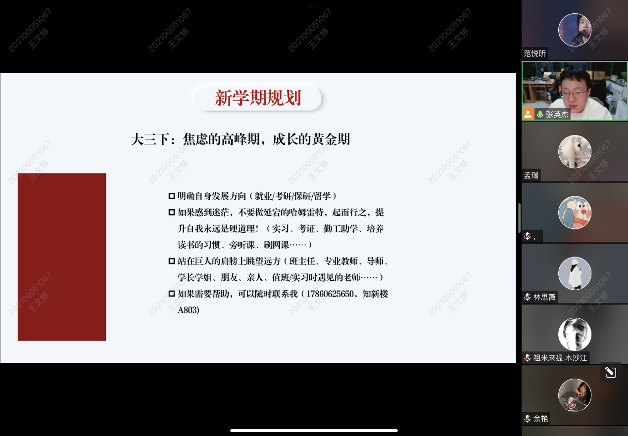 会上,张英杰结合自身经历,与同学们深入讨论大三阶段面临的多样选择、承担的各种压力,并引导同学们明确自身发展方向,做出新的规划,起而行之,提升自我。随后,张英杰向同学们介绍了科学的心理调适方法,通过改善作息、适当运动、管理规划等方式,以积极的心态和有效的方法接纳和应对焦虑,爬坡过坎,走出精彩人生。最后,张英杰强调了安全问题的重要性,提醒同学们注意身体健康、消防、出游、人际交往、信息网络等各方面的安全问题,并带领同学们观看了安全教育影片《生命重于泰山》。