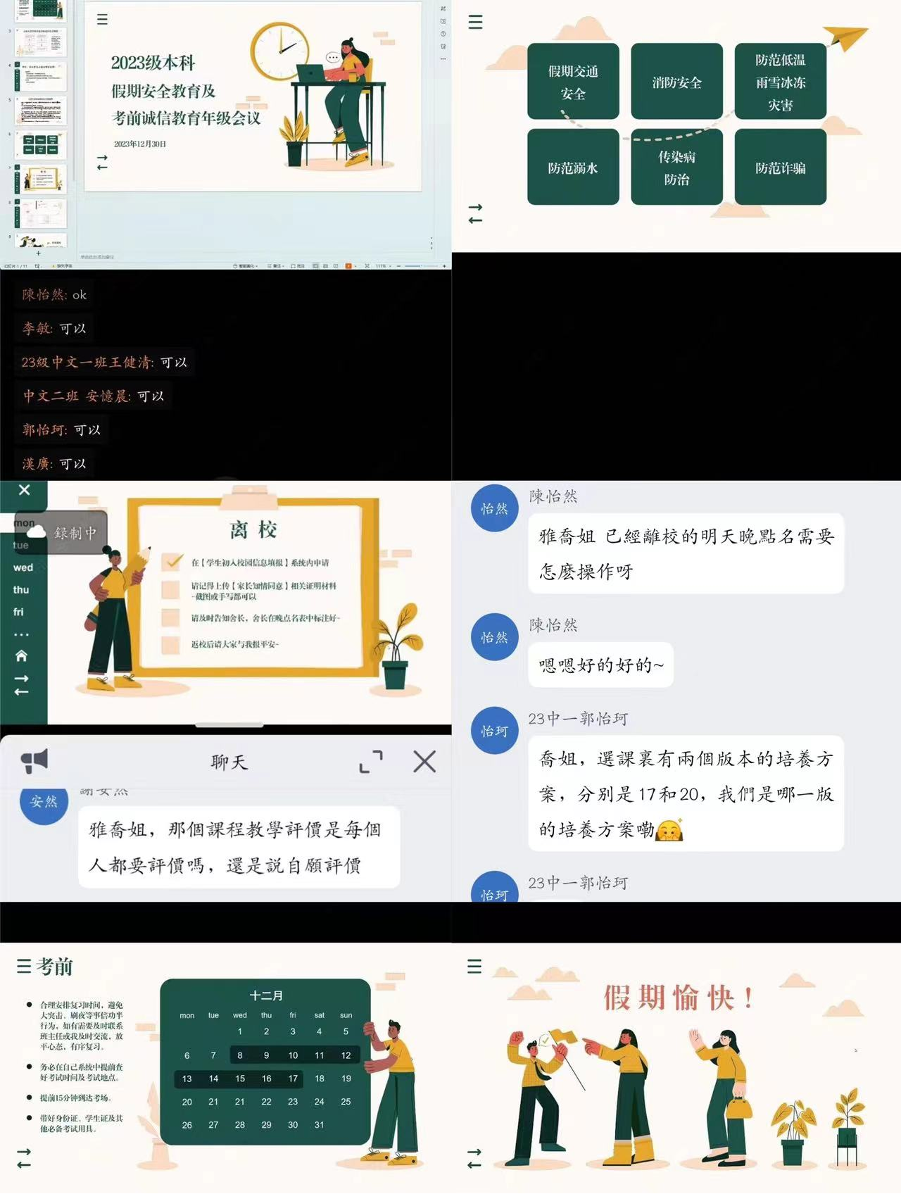 诚信考试教育结束后,孙雅乔对同学进行假期安全教育宣讲,宣讲内容分为假期交通安全,消防安全,防范低温雨雪冰冻灾害,防范溺水,传染病防治,防范诈骗六个板块。此外她还特别强调假期宿舍晚点名的事项并提醒同学们做好宿舍断电,卫生清洁的工作。随后,她向同学说明寒假离校的相关事项,包括放假时间、离校返校申请、假期学院值班情况以及寒假社会实践等问题。