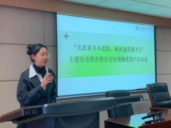 接着,权益委员刘畅作主题安全教育。刘畅给大家展播了往届优秀的安全教育短片,并进一步为大家介绍了快递诈骗、AI建模诈骗、电话诈骗等常见的诈骗方式。刘畅结合个人的所见所闻,提醒同学们善于甄别信息、严防信息泄露、谨防诈骗,并为同学们提供了面对诈骗的应对措施。