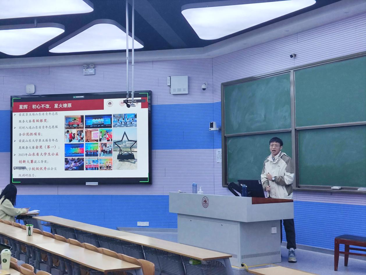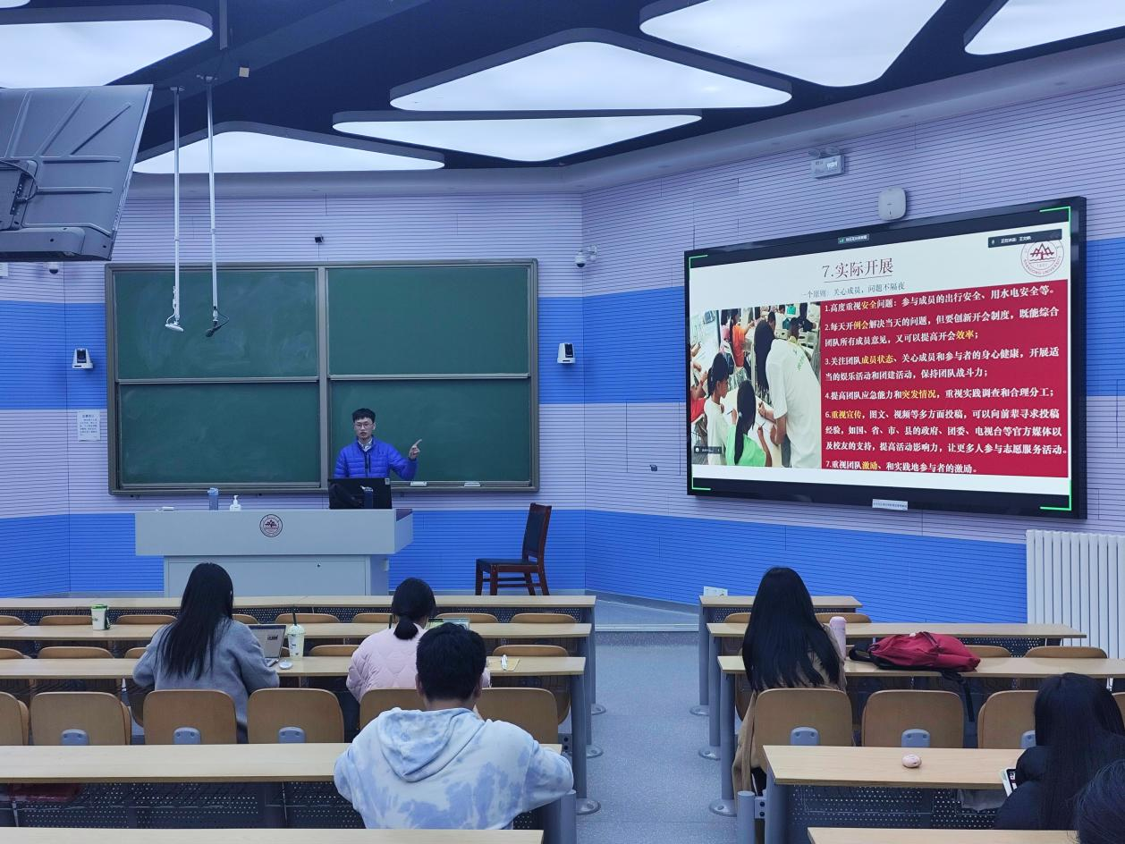 徐荣先向同学们介绍了社会实践评比标准,从实践项目选择与实践形式设计两方面分享了自身经验,并以自己的答辩PPT为范例讲解了社会实践报告答辩技巧。此外,他建议实践团队以团队、平台和资金三个关键因素为抓手,不断完善团队组织架构、高度重视宣传工作、积极争取校内外平台的支持与帮助,进而为社会实践顺利开展创造有利环境。赵灵虎则结合自身实践经历,从团队建设、团队赋能、宣传渠道等方面细致阐述了社会实践团队的组建流程与注意事项。他强调,实践团队应着重关注团队文化建设、营造良好团队氛围,以期增强团队成员的集体认同感与归属感、提升成员实践的积极性与主动性。