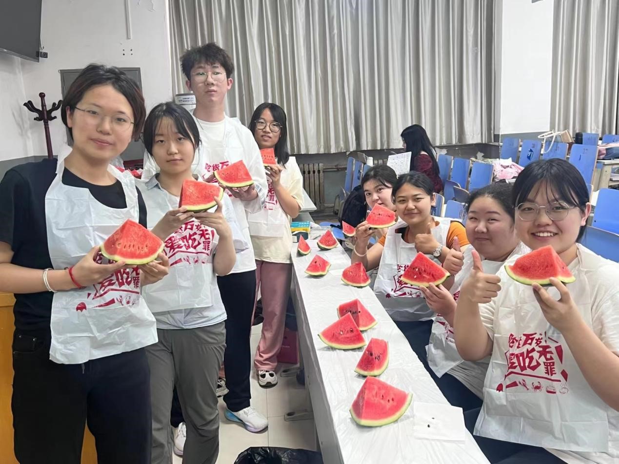 最后,中文一班举行“心理减压,轻松吃瓜”瓜王争霸赛。心情与美食联系密切,本次“吃西瓜”活动依据“美食欣赏效应”原理,分为小组赛和个人赛,在吃西瓜的过程中,同学们争分夺秒,为夺得“心理吃瓜瓜王”的桂冠而战。大口吃瓜,既缓解了同学们学习和生活的压力,也让同学们感到了满足和幸福,收获了心情的愉悦和内心的满足。