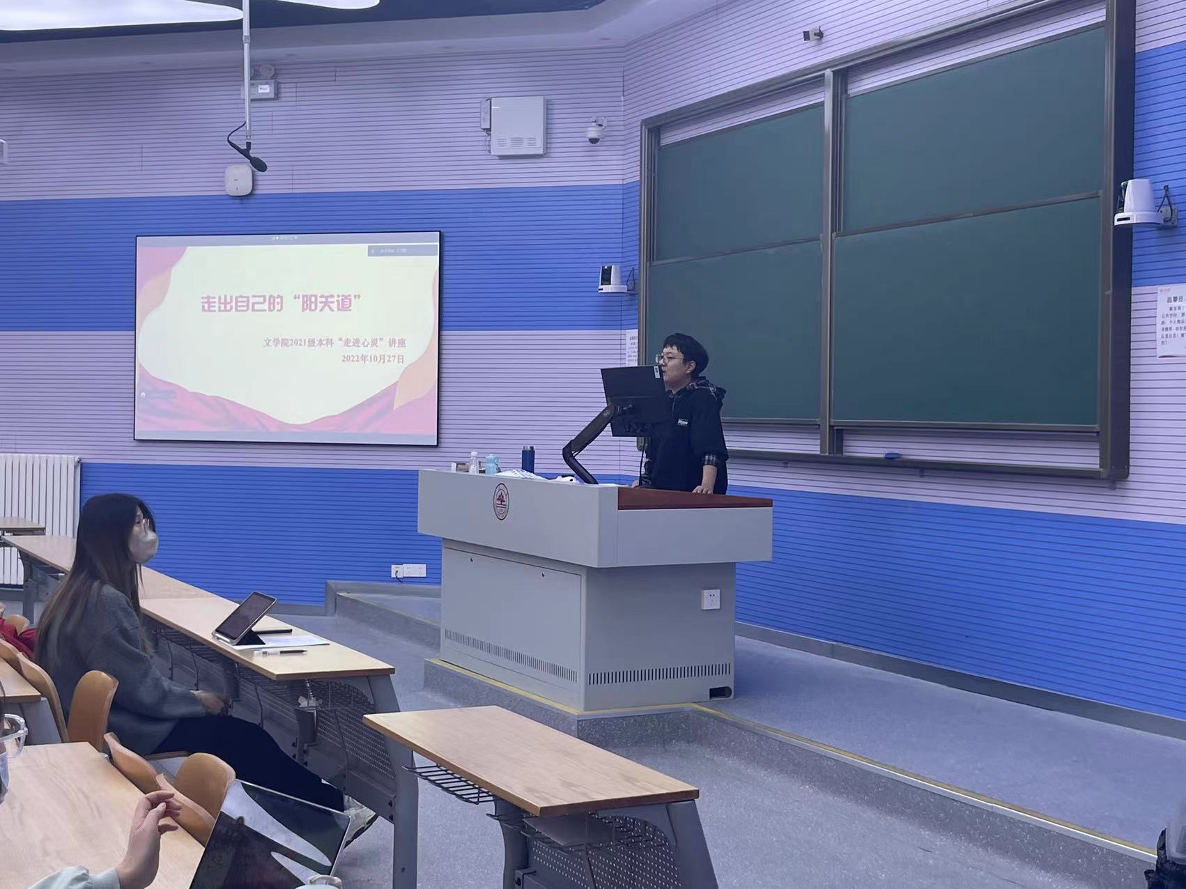 10月27日,为了帮助同学们树立健康积极的心态迎接接下来的大二生活,公司于董明珠楼211d召开了以“走出自己的‘阳关道’”为主题的“走进心灵”讲座,2021级本科全体员工参加,讲座由辅导员张英杰老师主讲。
