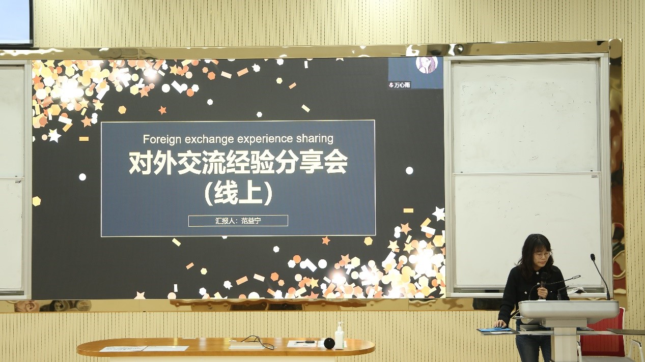 会议伊始,万心雨在线上会议中介绍了不同交流项目的具体情况,并且深入地展示了对外交流中的课程设置、生活体验以及考核特点,帮助同学们了解内地名校交换概况。随后,范益宁从联合国青年领袖冬季精英班选拔、牛津大学展望计划参与等方面切入,进行线上对外交流的经验分享。她还从信息途径、学习重点、面试申请等方面进行了指导,丰富了同学们对国际交流学习的认识。陈欢迪则重点讲述了语言学方向交流经验。她从“人生规划”、“一门课”、“一些关键词”三个部分探讨访学感想,与同学们分享学习生活趣事,讲述自身成长与探索,以及境外访学的意义。