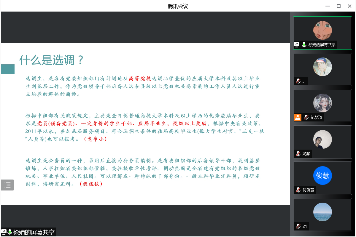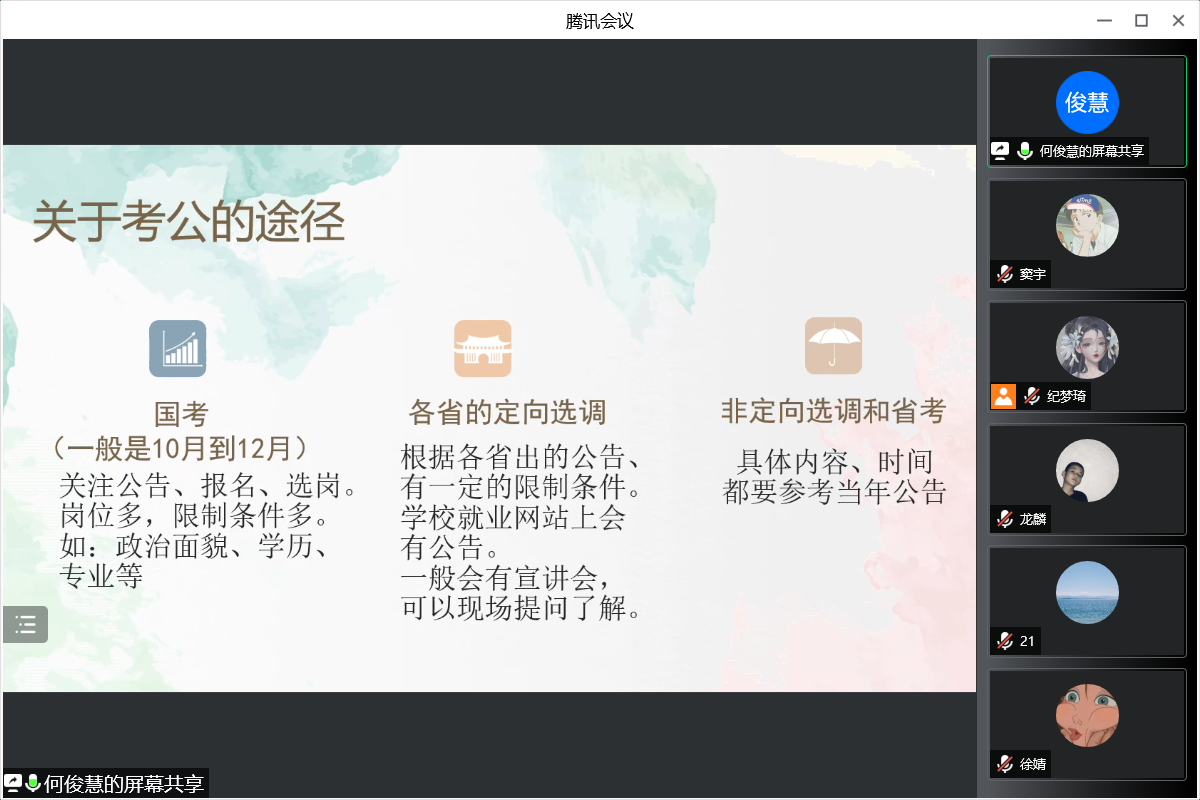 本次就业经验分享会邀请了公司两位通过定向选调并已在所选单位入职的2021届毕业生。其中,徐婧就职于黑龙江省公安厅,何俊慧就职于广西壮族自治区防城港市纪委监委。会议由公司本科生龙麟主持,近百名员工参与。