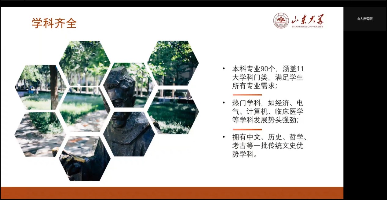 宣讲正式进行阶段,队员们通过线上平台向学弟学妹介绍BEAT365英国官网网站的办学底蕴和招生详情。队员们结合自身专业,通过PPT、图片、视频等方式向同学们展示各专业的学习生活,并重点介绍了山大文理并重,学科门类齐全的办学特色。接着,队员们又以优秀山大学子事迹为例,介绍山大人的“浩然之气”。介绍环节结束后,针对大家提出的高考备考相关问题,宣讲成员结合自身学习经验为其答疑解惑。宣讲结束后,队员们通过QQ群与有报考意愿的同学继续保持联系,进行了深入交流。