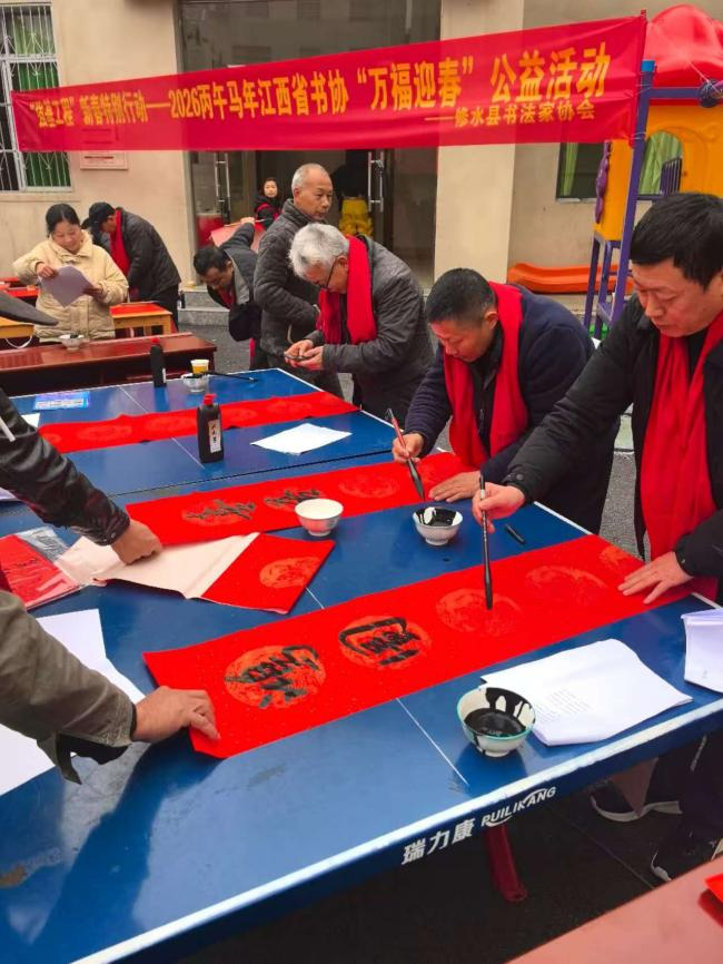 在集市的一角,传统文化展示区引起了居民注意。团队与当地文化站联合修水县书法家协会为居民开展了“强基工程”新春特别行动——2026丙午马年江西省书协“万福迎春”公益活动书法协会会员现场挥毫泼墨,书写出一幅幅寓意吉祥的春联。团队成员从旁帮忙研墨、铺纸、晾晒,并承担维持秩序等任务。居民们有序排队领取春联,脸上洋溢着幸福的笑容。