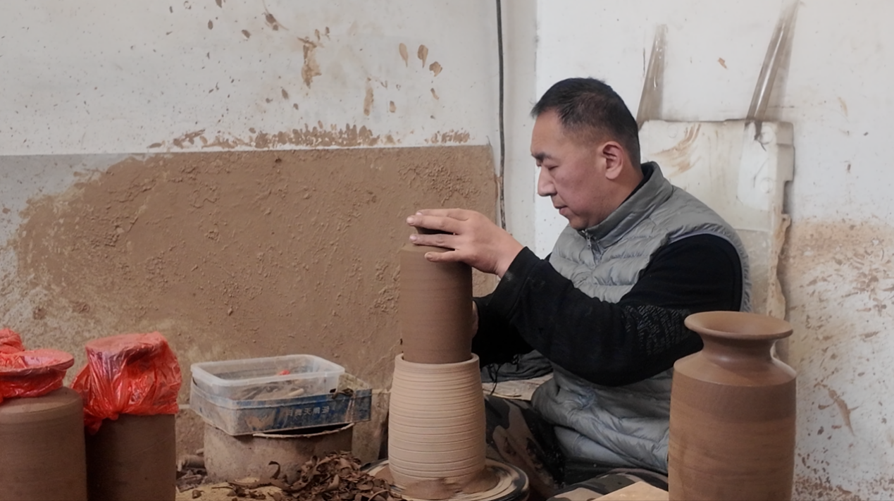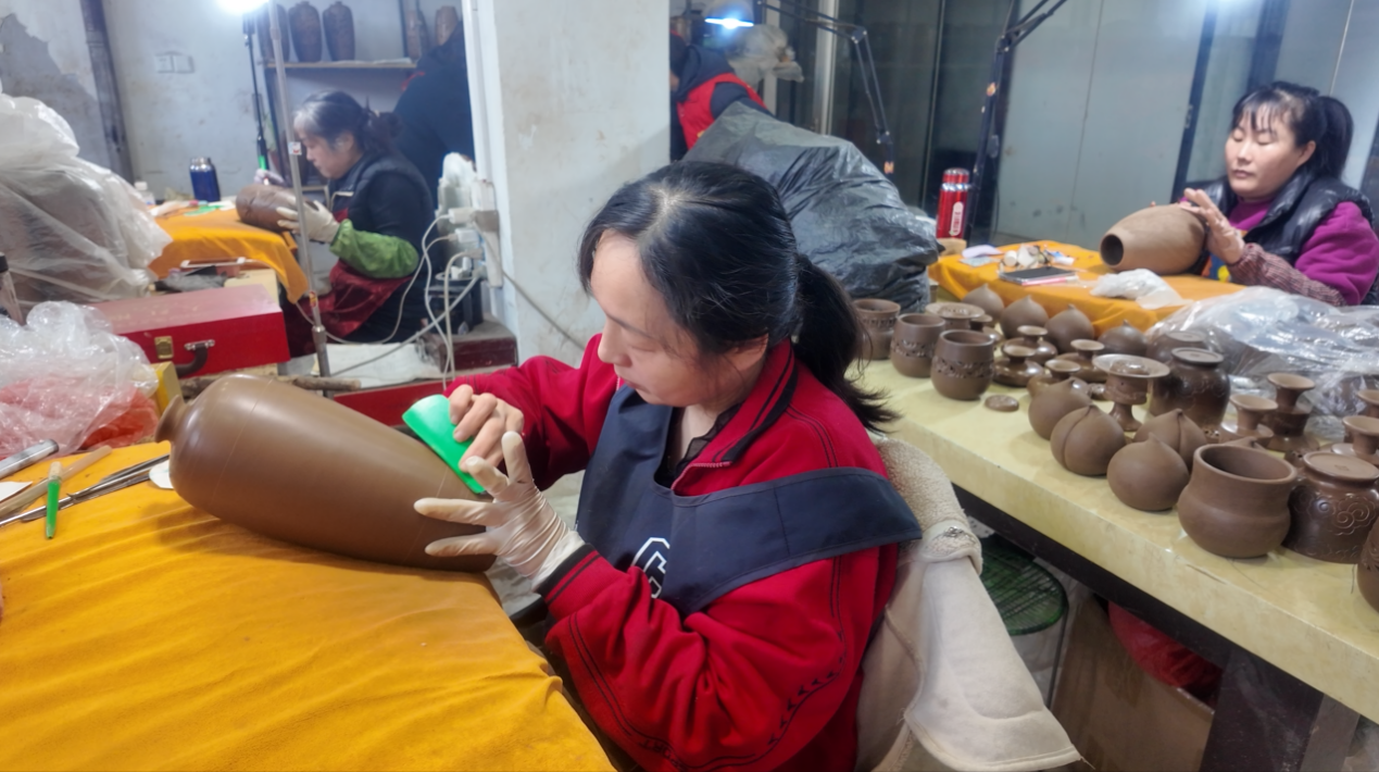随后团队前往刘德功黑陶艺术馆开展后续实践。踏入场馆后,队员们率先参观馆内展厅,近距离品鉴馆内藏品,既有复刻传统的古法黑陶器物,也有融入现代审美元素的创新作品,真切感受黑陶非遗技艺的传承脉络与创新发展。其次,队员们走进制作车间,现场观摩手工艺人制陶全过程,见证拉坯、刻纹、修形等一道道严谨细致的制作工序,清晰掌握黑陶制作的完整工艺流程。最后,在艺术馆资深黑陶技艺传承人胡老师的专业指导下,团队成员亲身尝试拉坯制陶,过程中虽遭遇重心不稳、力度不均等问题,但大家在反复调试、相互探讨中逐步掌握基础手法,均顺利完成简易陶坯制作,以亲身体验真切体会到黑陶制作的工艺难点,对非遗技艺背后的匠心内涵形成更为直观且深刻的认知。