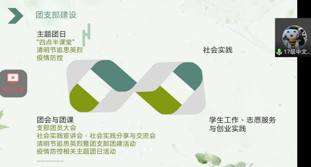 本次答辩会促进了各团支部之间的工作经验交流与分享。疫情期间,各团支部针对实际情况开展“防控疫情、从我做起”主题团日活动,定期组织疫情防控专项线上学习,发起抗疫作品征集等。汉一多2019级团支部创新组织运行,采取“8×5”组织管理模式,在团支部设立8个团小组,由5名支部委员分别对接;中国语言文学2018级2班团支部重视学风建设,定期组织开展开展“同学学习经验交流会”与“班主任学习方法分享会”;汉一多2017级团支部关注“青年大学习”的知识落实情况,就每次学习后的课后习题与支部团员进行线上分享交流,记录学习心得,明确学习意义,进一步巩固所学知识。公司通过对学年工作的总结与反思,进一步优化各团支部的基层组织建设模式,以评促建,展望未来,相信本次会议对今后各团支部的活动开展能够提供宝贵的借鉴意义。