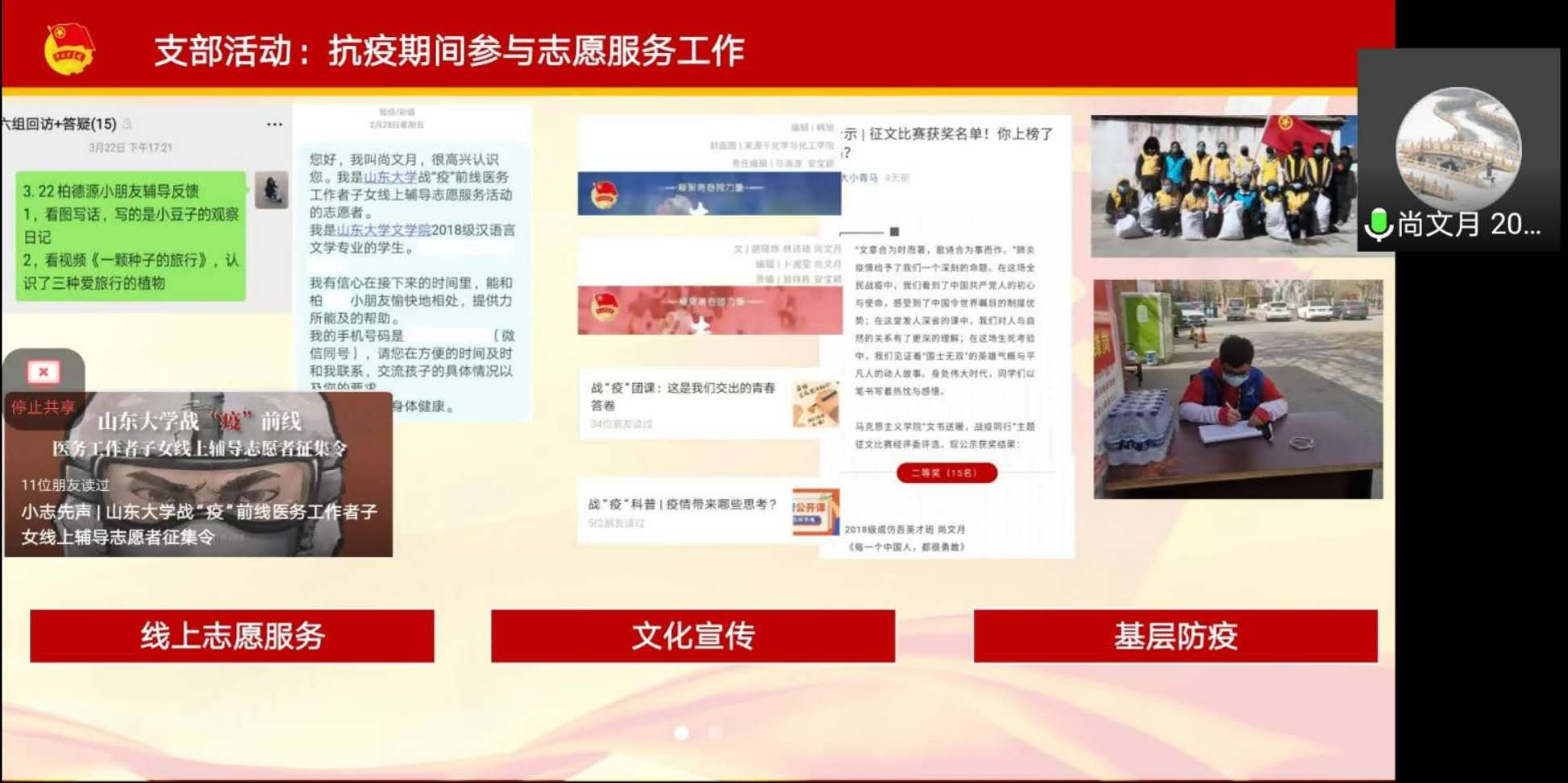 4月5日下午,公司于线上开展了2020年度团支部“达标升级”答辩分享会。会议由公司团委副书记苏靖雯主持,2016级辅导员李国强、2019级辅导员孙雅乔、2016级员工代表王宇超及各团支部评选代表参加本次答辩分享会。