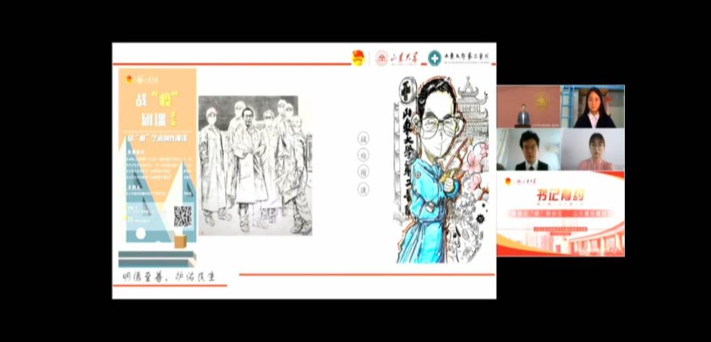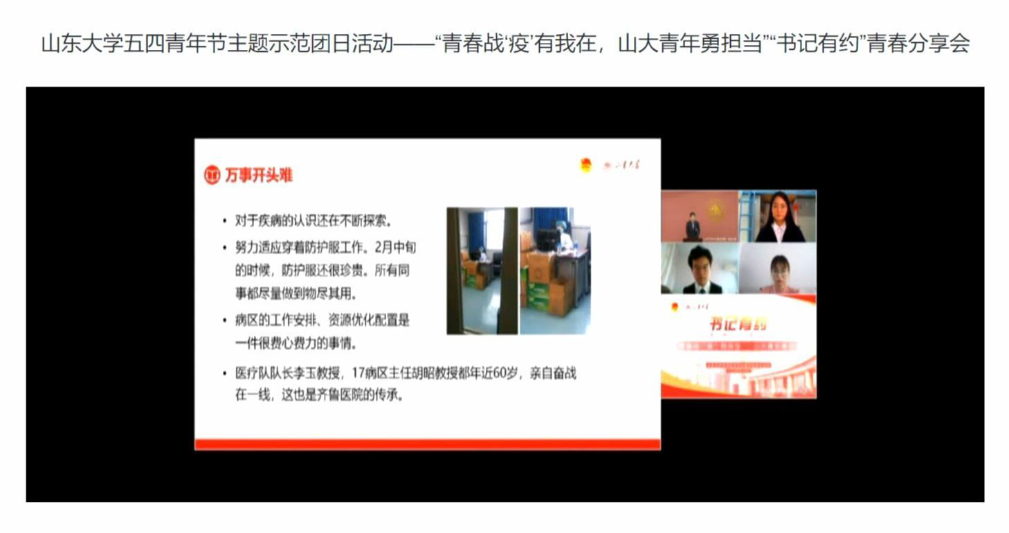 接着,来自学校各单位的9位青年师生及医务员工代表在会上畅谈学习体会,讲述了他们的战“疫”故事。三位援鄂医疗队青年代表,齐鲁医院重症医学科主管护师郭丙秀、齐鲁医院呼吸与危重症医学科主治医师季翔和第二医院重症医学科护师宋淳分享了他们亲赴前线,不惧危险,用自己的生命抵挡病毒蔓延的故事。三位青年教师代表展示了疫情期间投身学术和教育事业的成果:药学药物化学研究所副教授展鹏投身药物研发,国际教育学院副教授孙雪霄认真筹备线上教学,化学与化工学院团委书记张洁尽心尽力地服务员工。三位青年学子代表分享了自己的战“疫”经历与感受:留校的威海校区法学院硕士研究生李亚兰积极配合学校工作,有序安排在校的学习生活;来自湖北的政治学与公共管理学院硕士研究生孟鑫作为在鄂临时团支部成员,在学校师生的鼓励下,坚定信心,勇敢面对疫情,并表示期待早日回校与老师同学相见;参与志愿服务的外国语学院本科生马文啸,抗击疫情期间参与了诸多志愿服务活动,成为青年人的榜样。他们都是当代青年人勇敢担当的最好例证,展现了山大青年顾全大局、与国家同呼吸共命运的胸怀,以及新一代优秀青年学以致用、发挥己长、积极担当、贡献社会的精神。