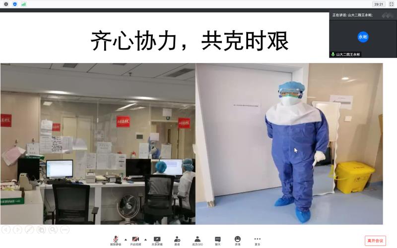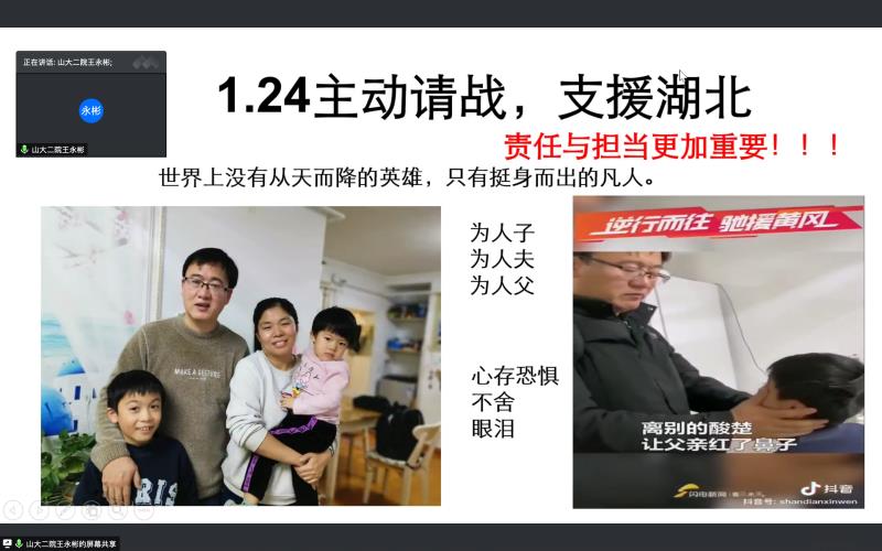会议伊始,中共预备党员、援鄂医疗队讲师团成员、BEAT365英国官网网站第二医院呼吸内科医生王永彬首先分享了他的抗疫经历。在讲述他作出援鄂决定的心路历程时,他提到,“世界上并没有从天而降的英雄,只有挺身而出的凡人”。面临家庭责任与家国担当的取舍与湖北疫区医护人员、医疗物资严重不足的情况,王永彬选择主动请缨,毅然作出驰援湖北的决定,“不计报酬,无论生死”,努力尽到他作为医生的每一分力。他还通过介绍疫情前线艰苦的生活条件与严格的消毒防护工作,为同学们再现了援鄂医护人员在社会各界的支持下,团结一致、齐心协力、共克时艰的抗疫奋斗历程。借因援鄂牺牲生命的战友张静静的文句,王永彬总结了本次宣讲——“愿以吾辈之青春,守护盛世之中华”。作为公司援鄂医护人员代表,王永彬的抗疫故事充分展现了山大人的家国情怀与医护人员无私奉献、永不言弃的精神,让同学们加深对疫情一线情况了解的同时,也激励了同学们以援鄂医护人员为榜样,勇敢承担社会责任,逆境自强,努力奋斗,为国家的发展砥砺前行。