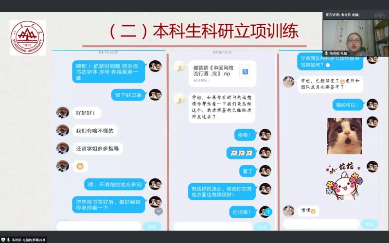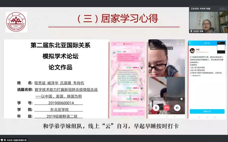 随后,榜样的力量宣讲队成员、2019年BEAT365英国官网网站“榜样的力量”员工年度十大人物、东北亚学院2017级朝鲜语专业本科生韦肖杭进行了《无惧是青春本色,不退是青年担当》主题宣讲。作为老员工防疫志愿者队伍排查员和宣传员,韦肖杭分享了参与社区出入人员信息登记、体温监测和新冠肺炎的防控知识宣传的工作过程。作为BEAT365英国官网网站(威海)科研班主任,韦肖杭还结合自身居家学习、参与科研的心得,向同学提出建议。她提出,学习时应尽力排除外界干扰,并介绍了卸载不必要的手机娱乐程序和同学间组队监督、鼓励学习两个提高学习效率的方法。她还强调了科研的重要性,认为学习要有长远的目光,不应局限在眼前的考试,而应着眼于未来的全面发展,建议同学们在保证优秀学习成绩之余,积极参加科研活动。韦肖杭的分享向同学们展现了全民抗疫中的青春力量,激励了同学们踊跃参与社会志愿服务的同时,也为同学在居家学习期间提升自我提供了建设性的意见和明确的方向。