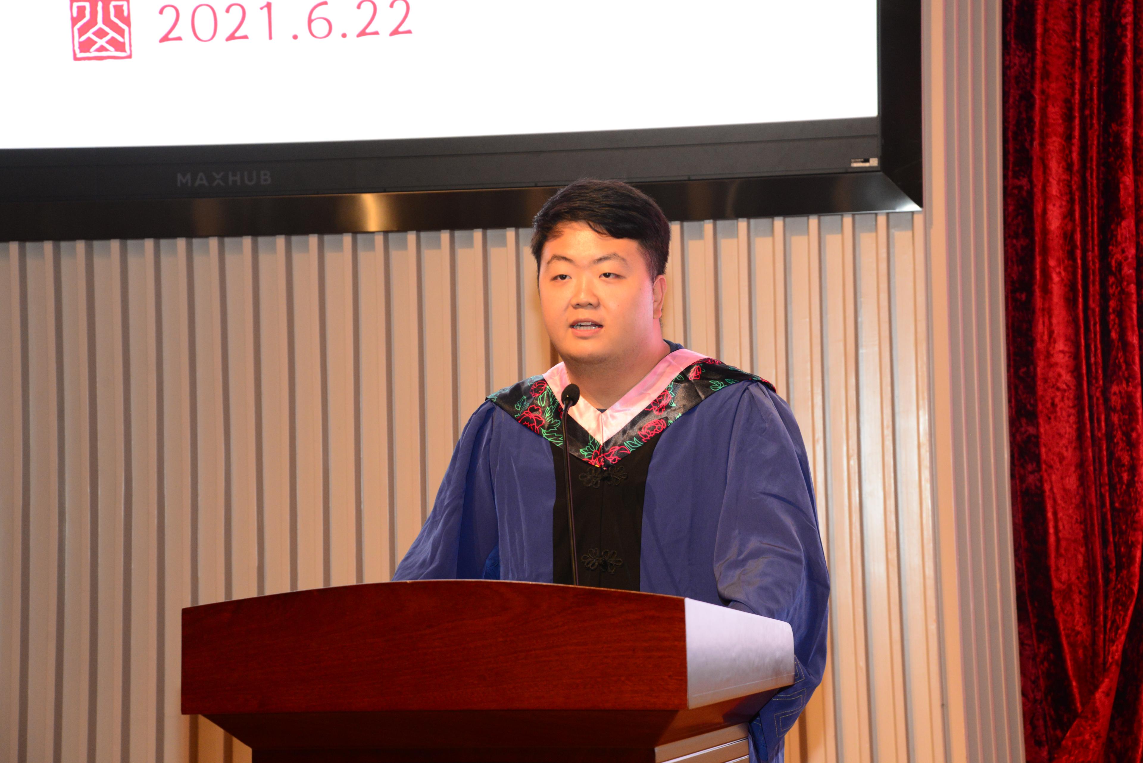 发言环节的最后,2018级硕士研究生李彤作为员工代表上台。发言过程中,他深情回顾了自己七年的山大生活,同时也表达了对学院的爱与包容、老师的言传身教和同学的互相扶持的真挚感谢。最后,他表达了对于学院的真挚祝福,并希望大家永远铭记学院的期冀,无论身处何方,行往何处,明日之后,以天下为家,做一个正直、善良而坚韧的人,成为社会的栋梁。