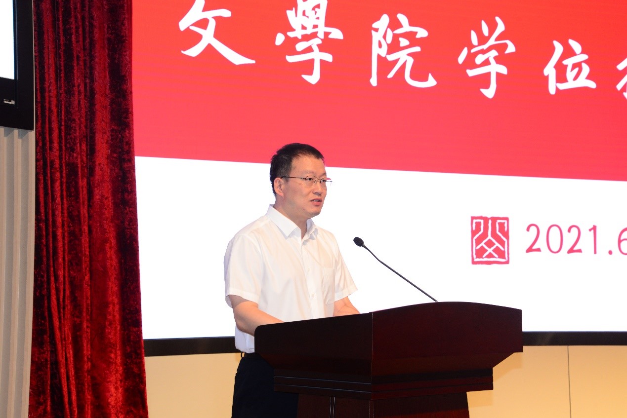 随后,李剑锋宣读学位授予决定。张帅宣读优秀毕业生表彰决定。两位领导分别为毕业生送上了真挚的祝福。在教师代表发言环节中,张燕芬副教授上台致辞。她首先祝贺大家圆满毕业,并回忆了17级本科生们在第一节现代汉语课堂上给她留下的深刻印象。接着,她提出了对同学们的希冀,希望每一位同学都能寻找到光明之德。她指出,在与大家的接触中,真切感受到了同学们在学习与生活方面的焦虑与彷徨,面对这种会伴随我们一生的焦虑,最主要的一点就是发现自身的光明之德。她接着说到,未来的路不都是平坦的康庄大道,平平仄仄才是正常的人生,而发现每个人自性的光明之德能够帮助我们走好人生甘苦与共的道路。最后,她肯定了大家的优秀,饱含深情地寄语大家明德知心,做一个自性光明的人:成为光,照亮自己;成为光,点亮别人;成为光,和母校的明德知新交相辉映。