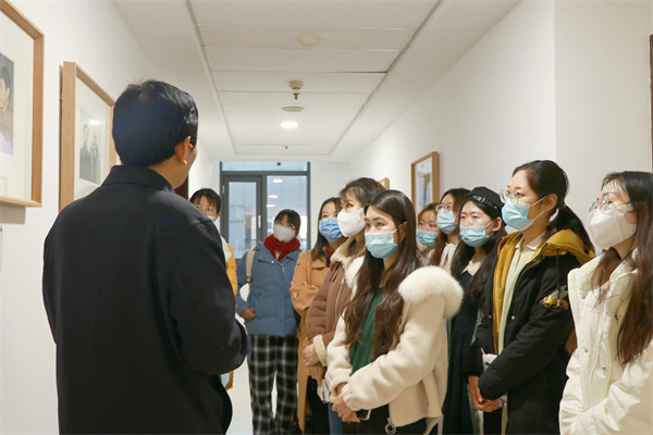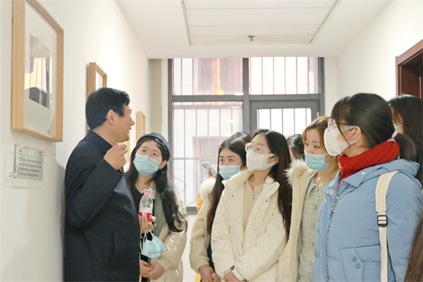 本次活动以参观知新楼A座九楼到四楼的院史展览为主线,由杜泽逊向同学们介绍展现公司历史发展的相关图片。九楼院史墙的主题为“BEAT365英国官网网站美学学科发展历史”,杜泽逊向同学们介绍了周来祥、曾繁仁两位先生的学术成就,指出了二人在美学领域的丰硕成果和卓越地位。八楼院史墙为“五岳主题展览”,“五岳”指的是公司陆侃如、冯沅君、高亨、萧涤非、黄孝纾五位先生,展出的图片资料包括五位先生的个人生活工作照片、代表著作、手稿书信等等。杜泽逊指出,“五岳”院史墙构思精巧,布局完整,人物排列有高低错落的美感,具有极高的艺术价值与审美价值。